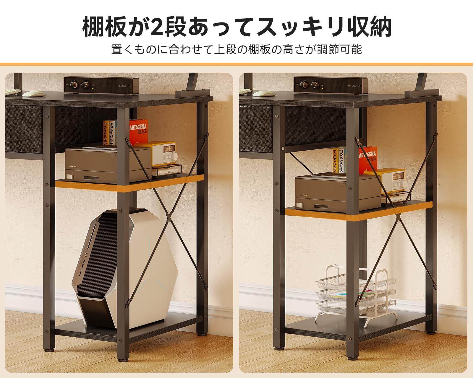 【収納力満載のラック、手の届く便利さ】ラックには棚板が2段あり、置くものに合わせて上段の棚板の位置が調節可能です。下段の棚板はCPUシェルフで、PCケースなど大きなものは収納できる。お好みに合わせて、ラックの部分は左右どちらにも設置OK。限られたスペースで効率的な収納を実現しています。