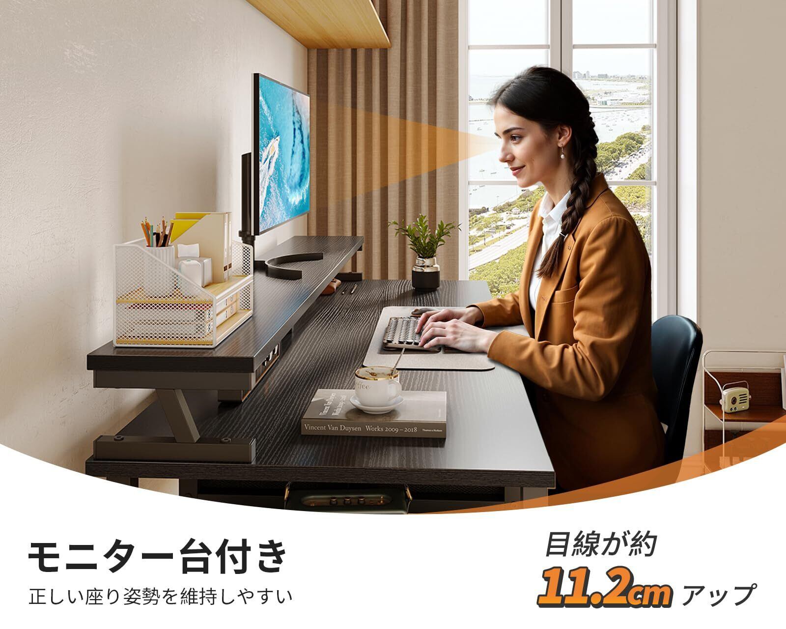 【モニター台付き、卓上の使用面積を広げる】天板より約11.2cm高いディスプレイ台は正しい座り姿勢に導いて、首や肩への負担を軽減して、長時間座ってもラクラク~モニター台は収納空間も作り出し、卓上の勤務スペースを解放し、デスクが広く使える。