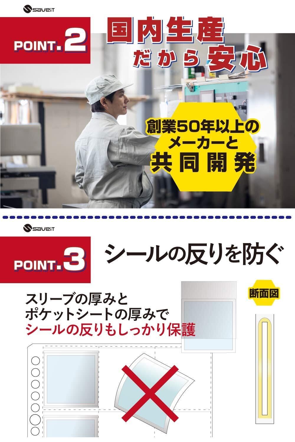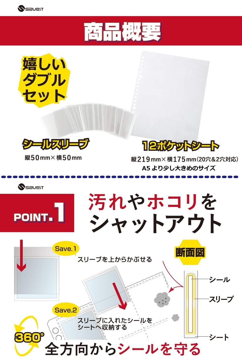 【汚れやホコリをシャットアウト!】 商品画像のようにシールスリーブを上からシールにかぶせて、その後ポケットシートに挿入していきます。ポケットシートとシールスリーブのダブル使用で汚れやホコリなどの360度全方向の侵入から大切なシールをしっかり保護・保存します。 【国内生産だから安心!】 当商品に使われている12ポケットシート・シールスリーブすべて、日本国内で生産しています。すべてのともに創業50年を超えており経験豊富で各分野で実績多数の国内です。国内だから「安心・安全・高品質」「供給も安定している」「不具合に迅速に対応可能」など数々のメリットがあります。 生産工場と様々な面で距離が近いことにより、コレクターの皆様の声を反映し、改善を重ねていきやすい環境が整いました。