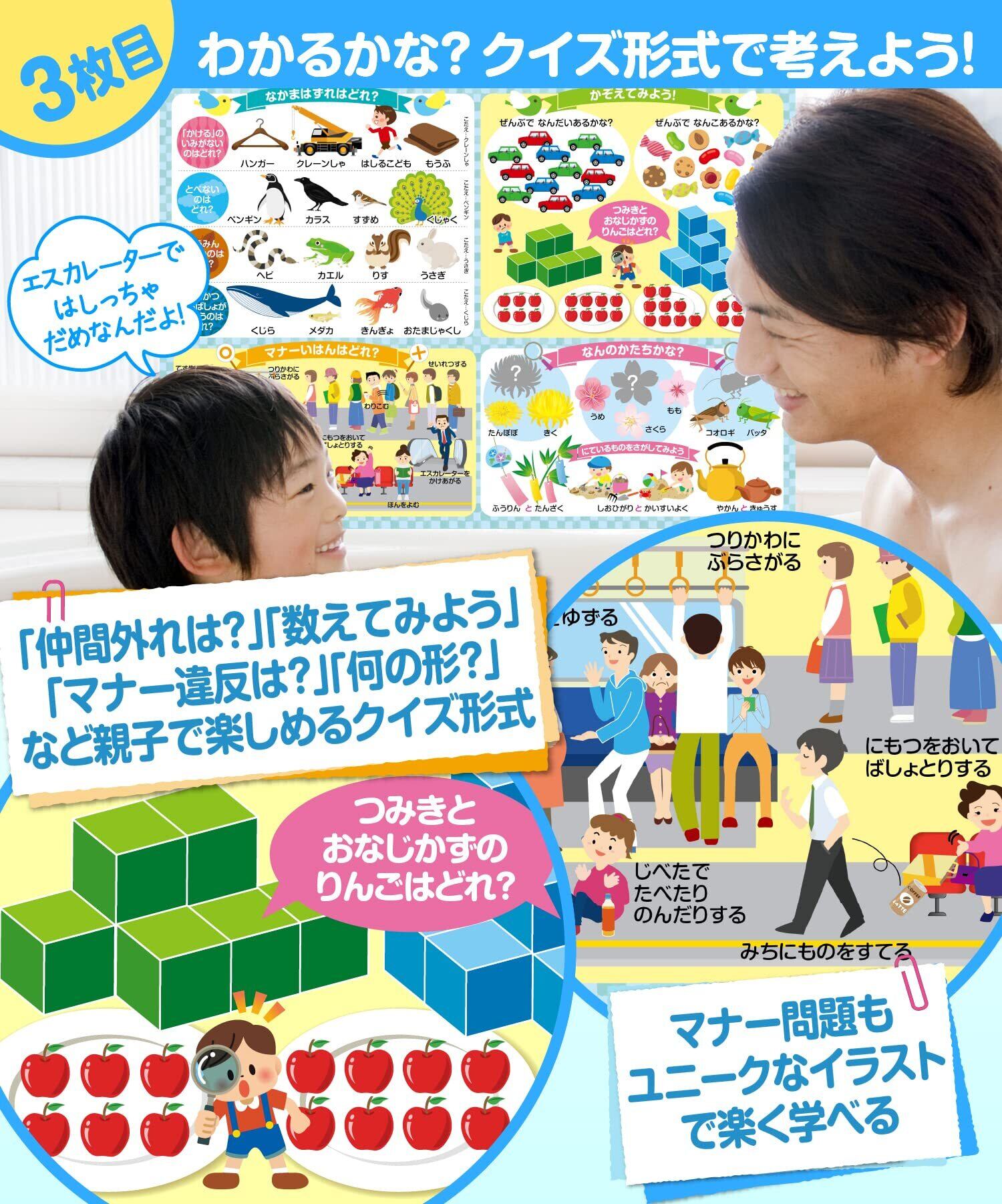 【親子でのコミュニケーションツール】 ポスターを使って、親子で一緒に学習することで、コミュニケーションの機会が増えます。例えば、ポスターの内容を元に会話をしたり、一緒にイラストを指さしながら学ぶことで、自然と会話が弾みます。このように、親子の絆を深めながら学べる点が大きな特徴です。