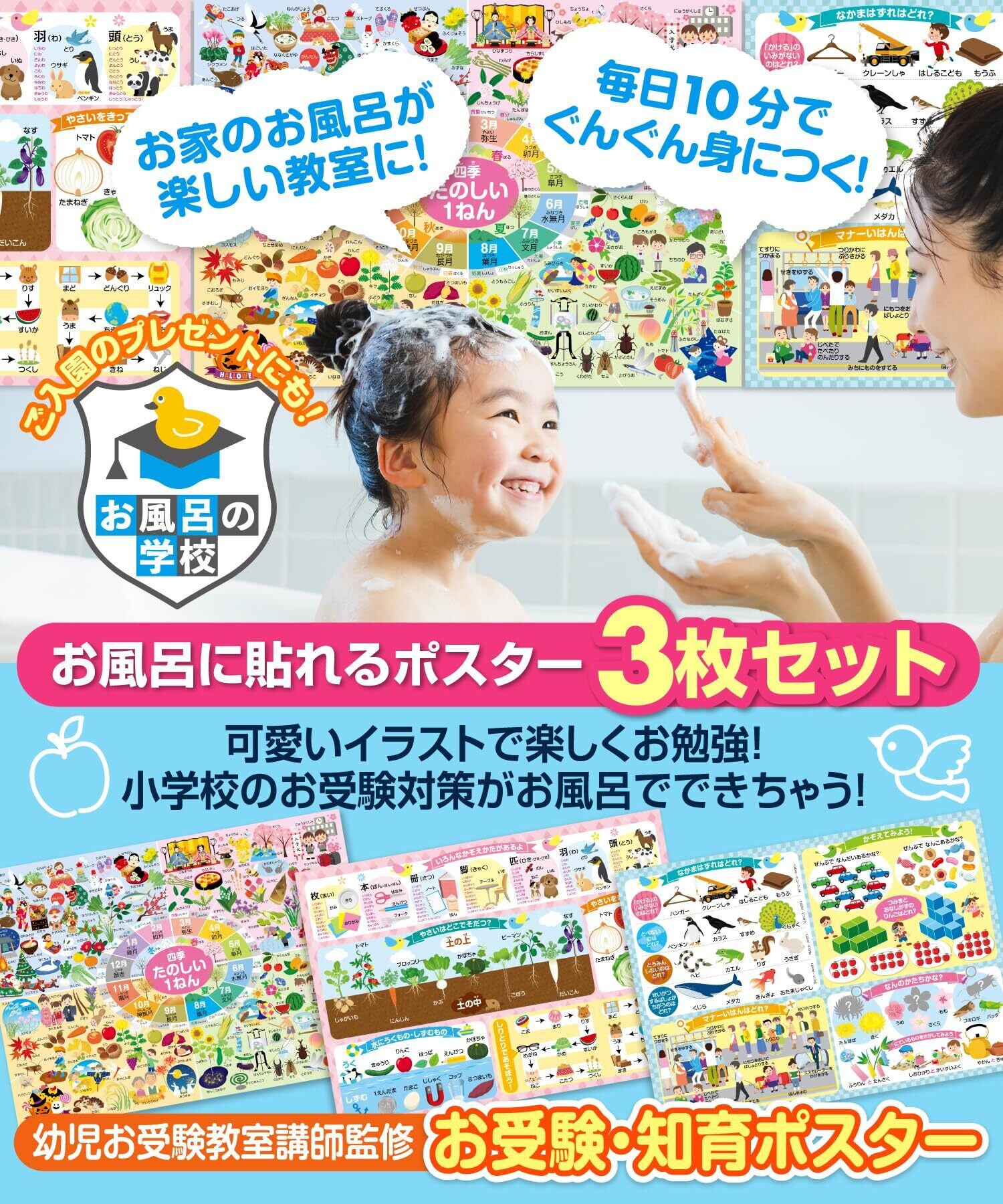 お風呂の学校 小学校 お受験対策 知育 学習 お風呂ポスター 3枚セット 日本製(季節の花・食べ物・行事・ものの数え方・二十四節気・マナー違反などを網羅) 小学校受験 B3サイズ 防水