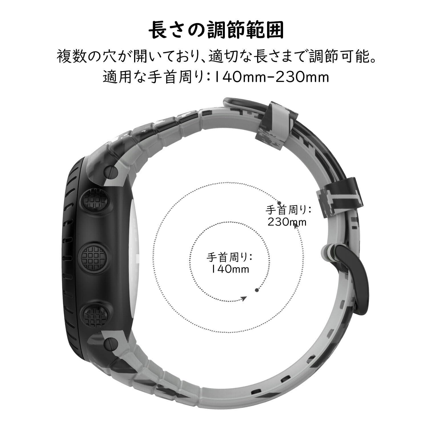 「適用の手首周り範囲」 ベルトに小穴が複数空いており、手首のサイズは 5.51インチ(140mm)から9.06インチ(230mm)調整できます。男女問わず適用します。