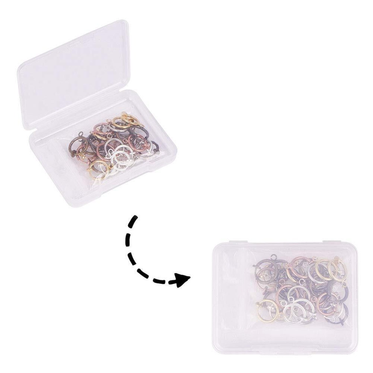 サイズ:幅約11mm、長さ15.5mm、厚さ1.5〜4.5mm、穴:1.5mm、6色、6個/色、36個/箱;コンテナ:6.8x5.2x1.1cm、1個。