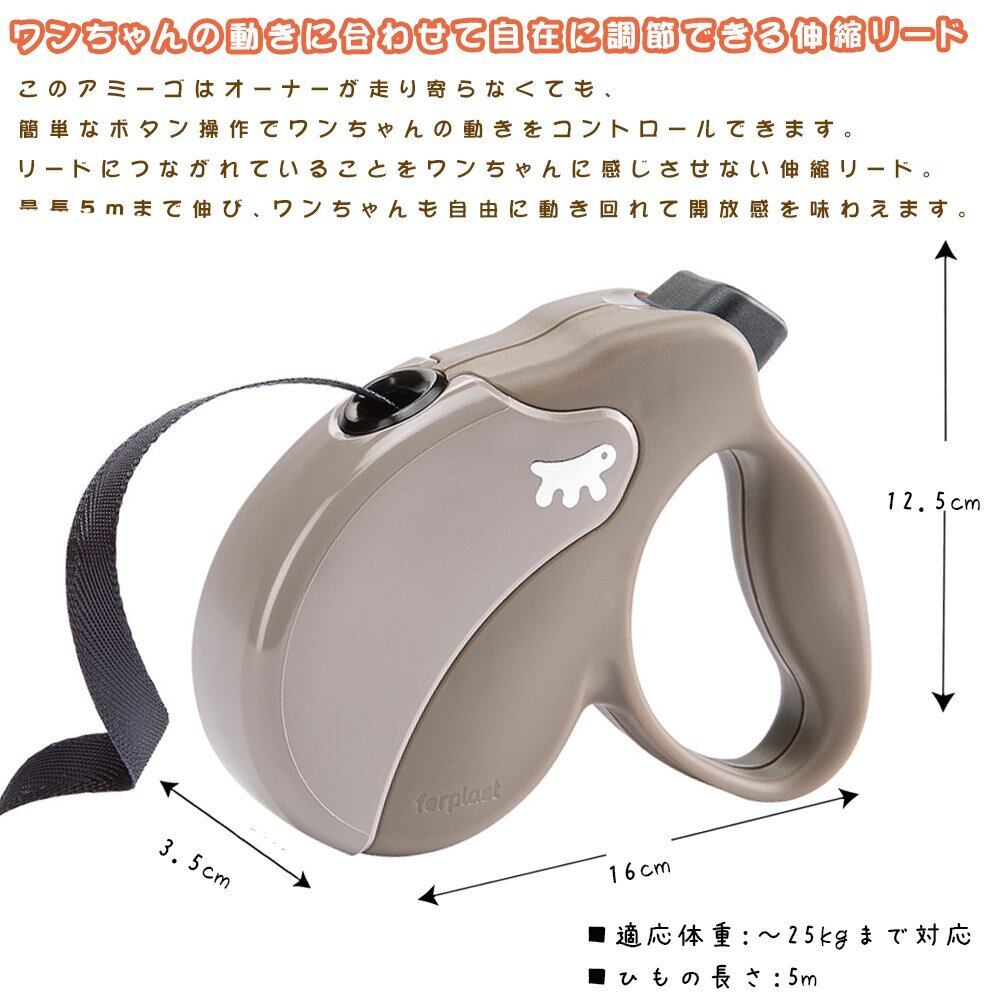 イタリアferplast社製。 ワンちゃんの動きに合わせて自在に調節できる伸縮リード。 広い場所でノビノビ走らせてたいけど、ノーリードはちょっと... このアミーゴはオーナーが走り寄らなくても、簡単なボタン操作でワンちゃんの動きをコントロールできます。 リードにつながれていることをワンちゃんに感じさせない伸縮リード。 最長5mまで伸び、ワンちゃんも自由に動き回れて開放感を味わえます。 ワンちゃんも飼い主さんも、もっとお散歩が楽しくなりそう ■幅X奥行X高さ(約):21X4.5X22cm ■適応体重:~25kgまで対応 ■ひもの長さ:5m ■MEDIUM ※リードを全部引き出した状態で連続した長時間のご使用はお控え下さい。内部のゼンマイ部分に負担がかかり破損する恐れがあります。散歩用ですのでけい留用としては使用しないで下さい。 ※イタリアのより商品の仕様、セット内容など変更が頻繁にありますので商品写真と異なる場合がありますがご了承下さい。例)犬猫用品や鳥用品、小動物用品の色・デザイン・サイズ・パーツの数が画像と違う等 ご注意(免責)>必ずお読みください ※イタリアのより商品の仕様、セット内容など変更が頻繁にありますので商品写真と異なる場合がありますがご了承下さい。例)犬猫用品や鳥用品、小動物用品の色・デザイン・サイズ・パーツの数が画像と違う等