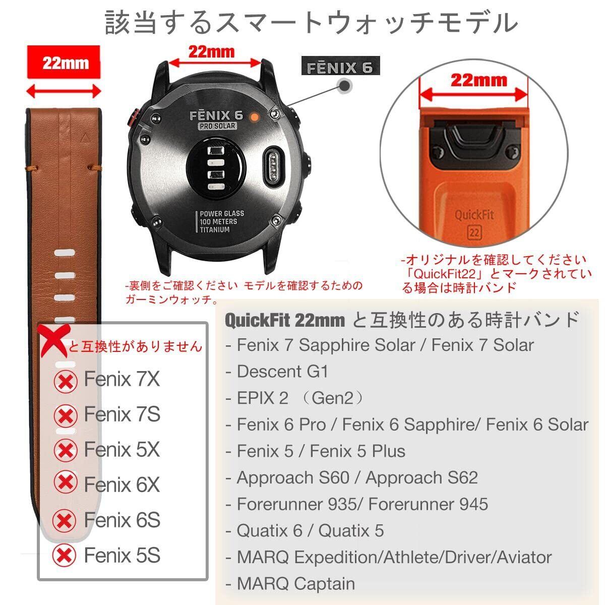 【該当するモデル】 スマートウォッチの背面にマークされているモデルを確認してください。QuickFit22mmストラップは、Fenix 8 47mm, epix Pro 47mm,Fenix 5/Fenix 5 Plus, Fenix 6/Fenix 6 Pro/Fenix 6 Sapphire,Quatix 6/Quatix 5,Approach S60/Approach S62 / S70 47mm ,Forerunner 935/Forerunner 945,MARQ Expedition/Athlete/Driver/Aviator/Captain/Golfer。 このストラップは、オリジナルのストラップに「QuickFit22mm」のマークが付いている他のGarmin時計にも適しています。