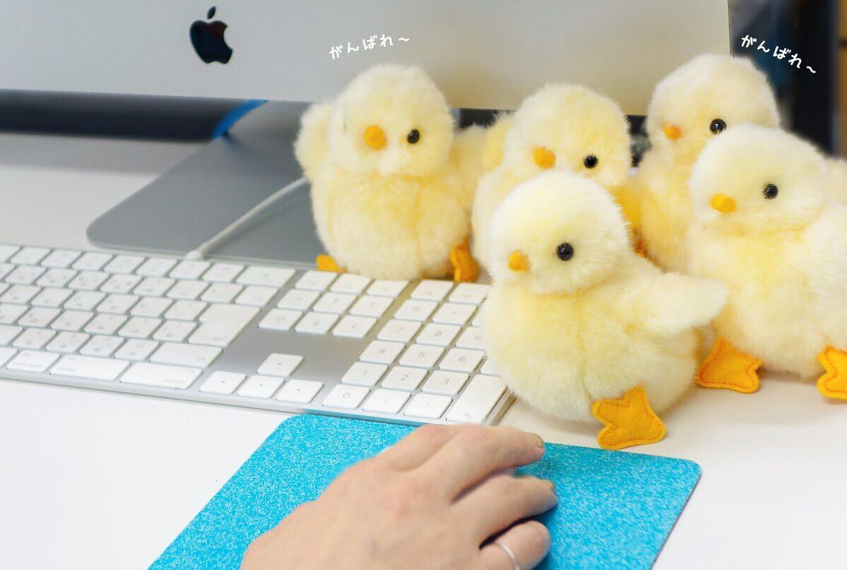 ふわふわの手触りが気持ちいいひよこのぬいぐるみ。つぶらな目や足もキュート。