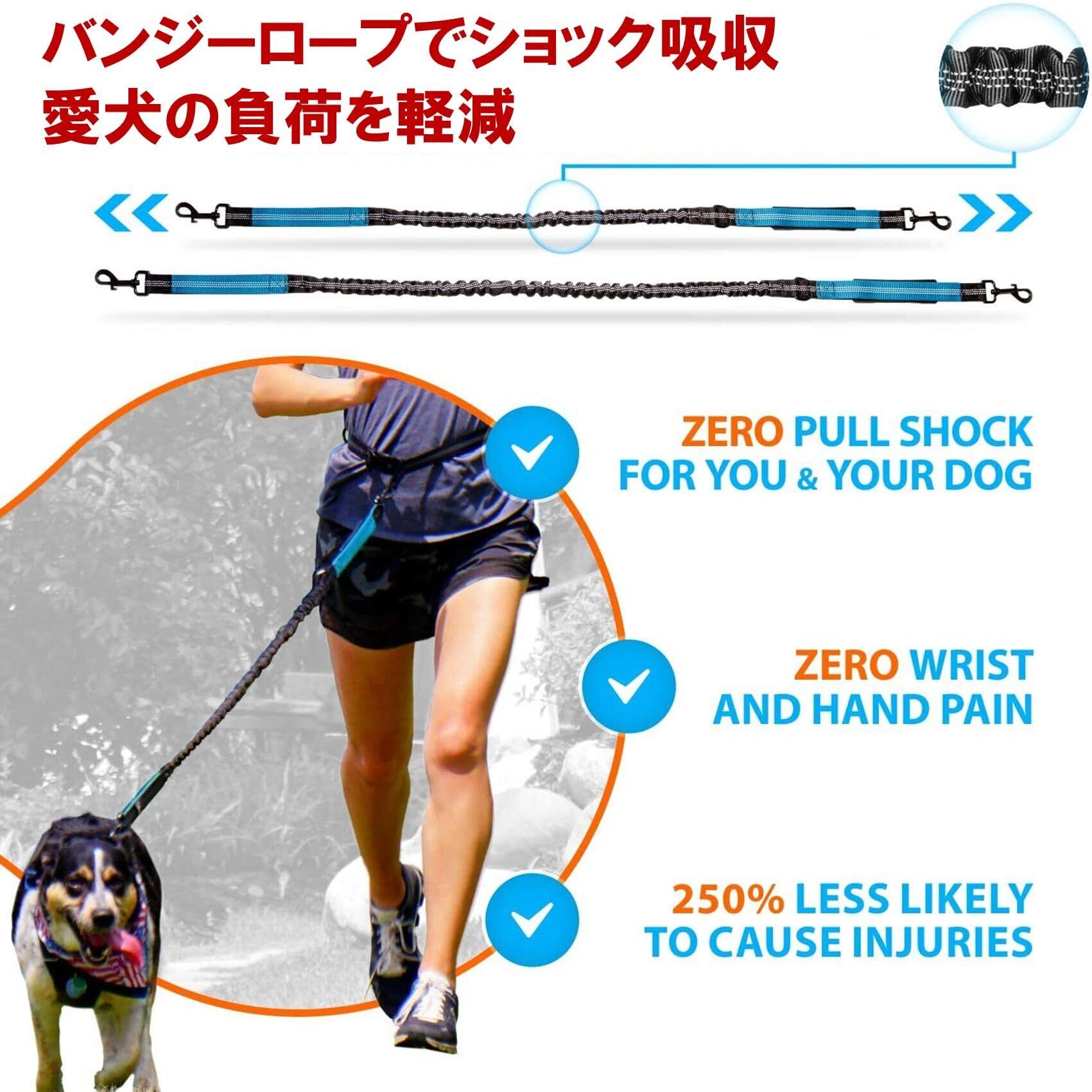 リード部はバンジーロープを搭載し、引っ張りなどのショックを吸収し愛犬の体への負荷、人間の手や手首への負荷を大幅に軽減します。衝撃吸収無しのリードと比べて、愛犬が怪我を引き起こす確率が大きく下がると言われています。