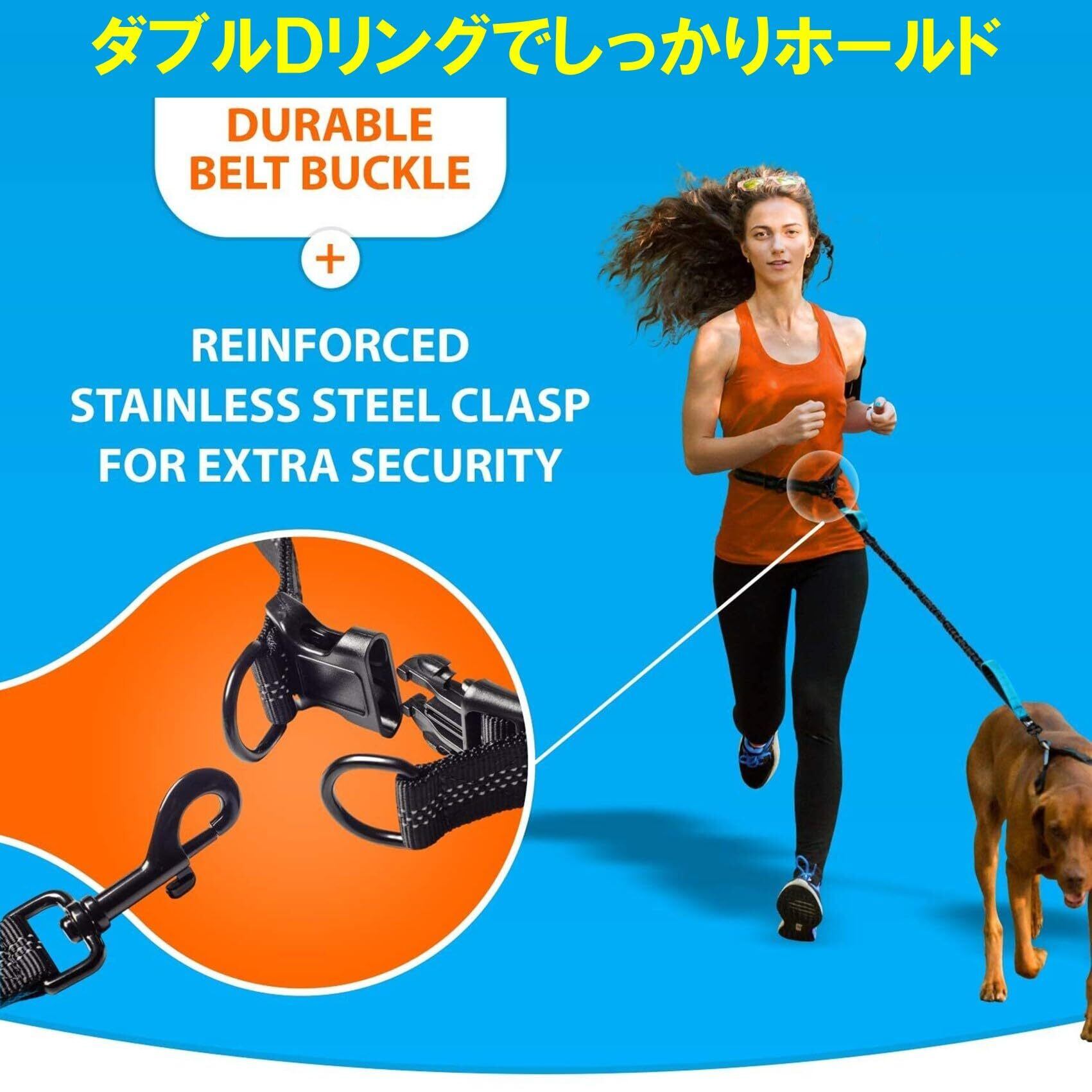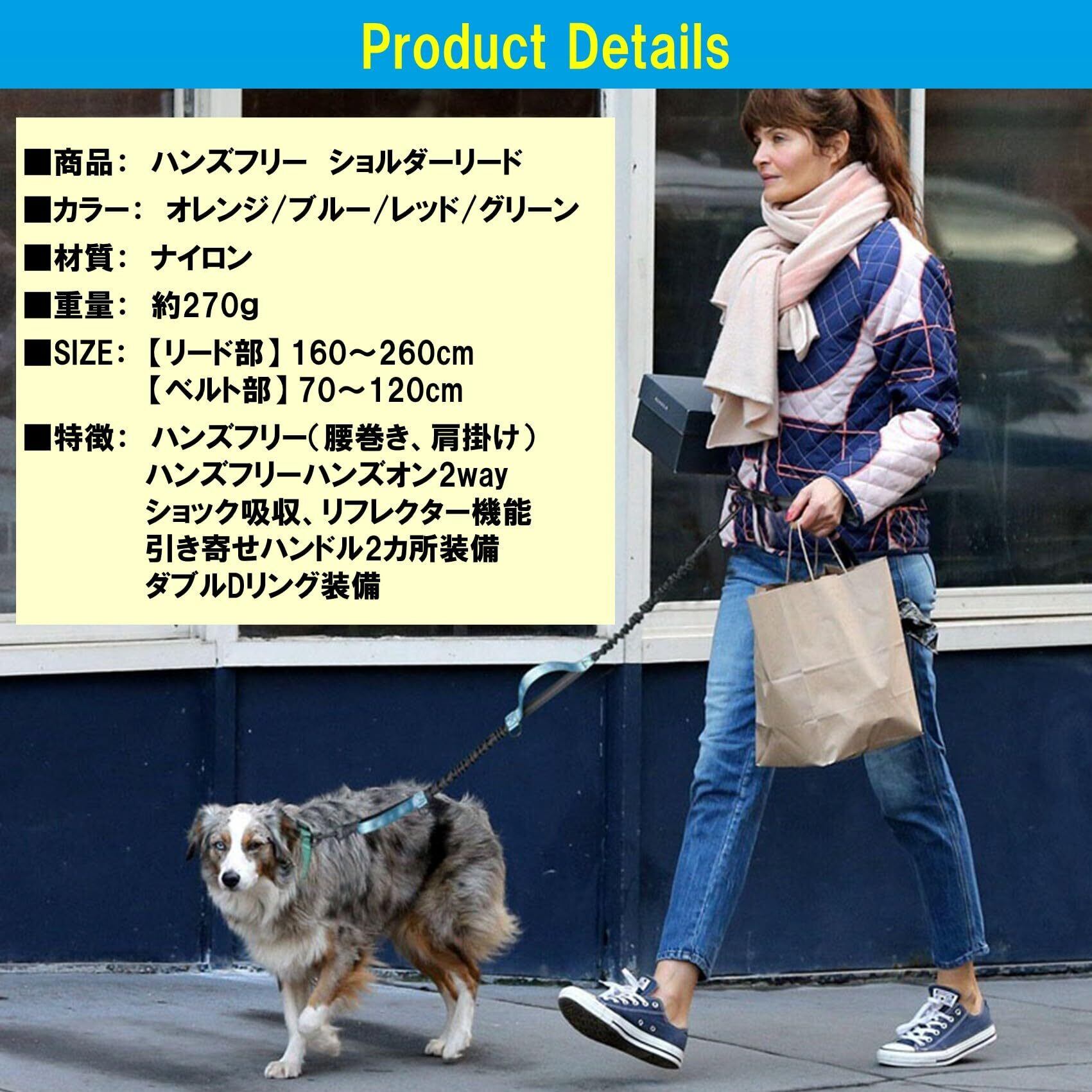 商品詳細:ハンズフリー ショルダーリード 【カラー】 オレンジ・ブルー・レッド・グリーン 【材質】 ナイロン 【重量】 約270g 【サイズ】 リード部:160-260cm(調整可)・ベルト部:70-120cm(調整可) 【特徴】 ハンズフリー(腰巻き・肩掛け)・ハンズフリーハンズオン2way・ショック吸収・リフレクター機能・引き寄せハンドル2カ所装備・ダブルDリング装備