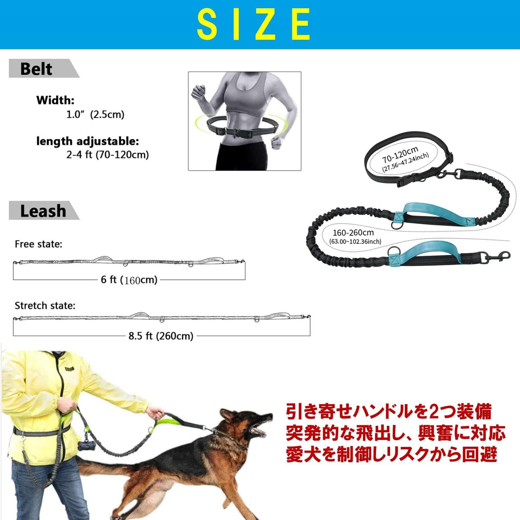 リード部の長さは160~260cmで調整可能です。ショートからロングまで長さ調整できますので散歩やジョギングなど様々な用途に合せてフレキシブルに調整することができます。ベルト部は70~120cmで調整可能です。ウエストに合わせた腰巻き装着、長めに調整して肩掛け装着とお好みで装着方法を選ぶことができます。 このショルダーリードには「引き寄せハンドル」を2カ所装備しています。愛犬の突発的な飛出しや興奮に対応することが可能で、愛犬を制御しリスクを回避できます。