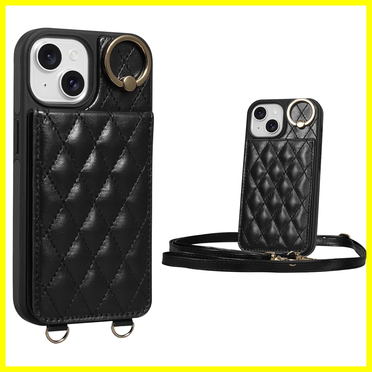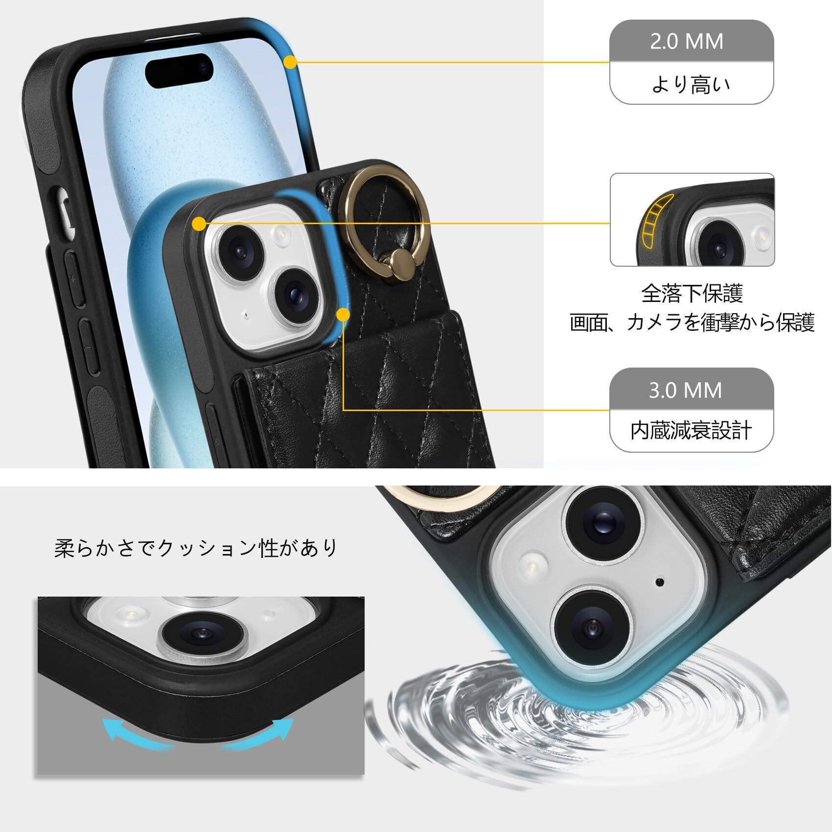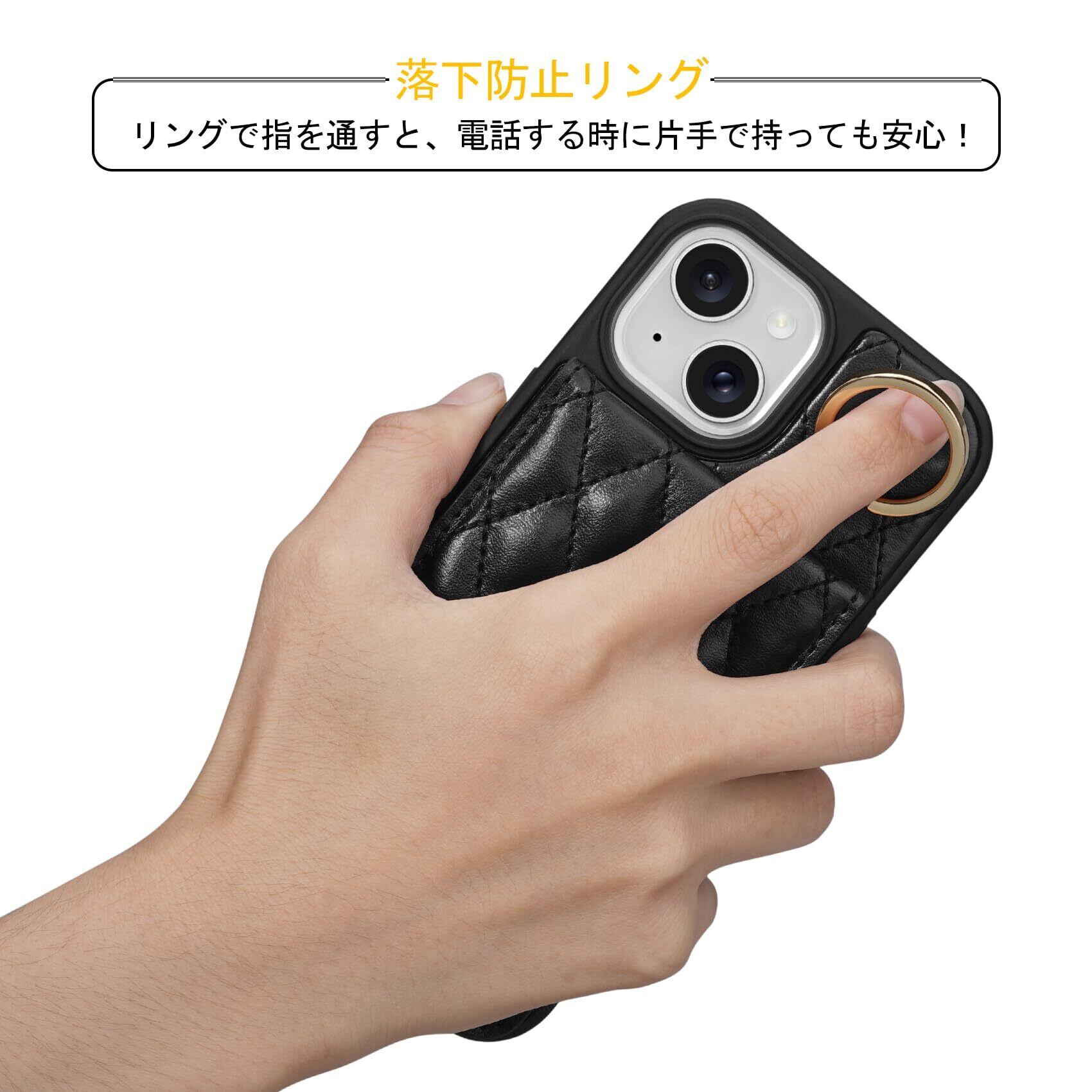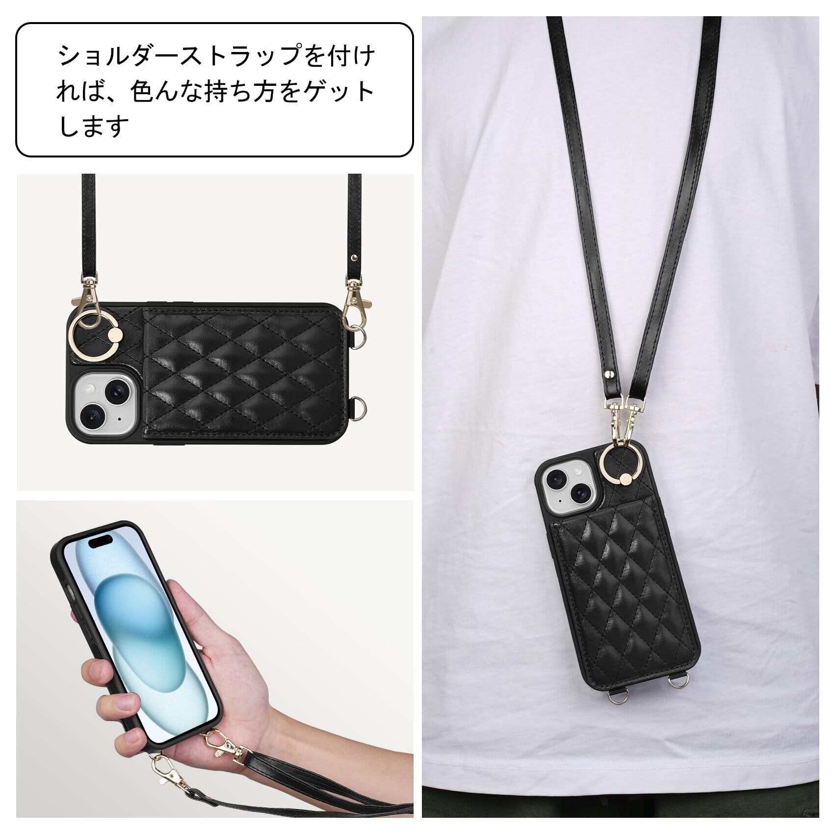 iPhone 15 対応 ケース 背面 手帳型 カードケース iPhone15 用 ショルダー ストラップ 手帳型ケース キルティング いphone 15 アイホン 15 用 スタンド 肩掛け カード収納 斜め掛け 首掛け PUレザー マグネット 可愛い チェック柄 格子柄 女性 菱形 おしゃれ 6.1inch ブラック