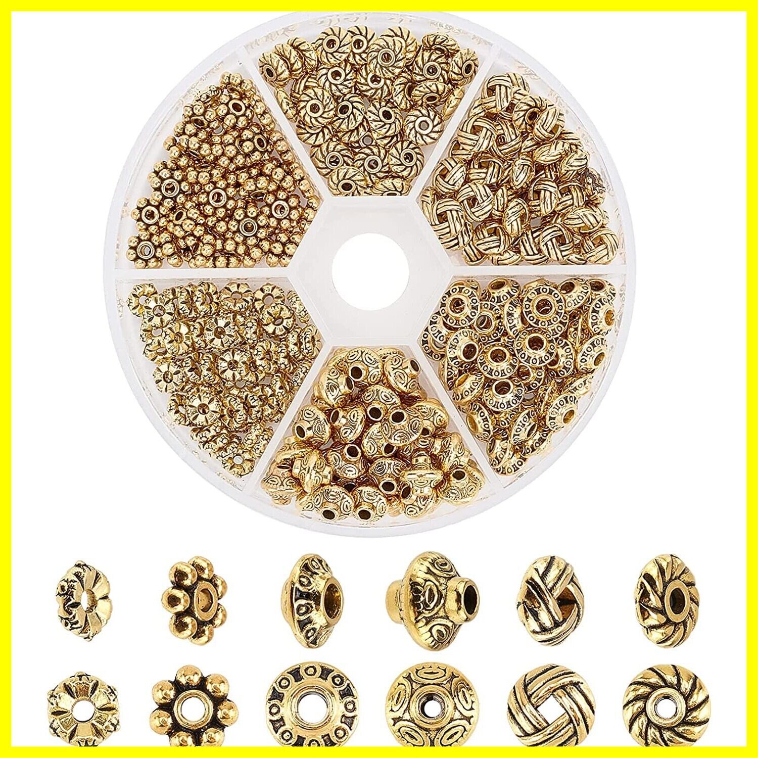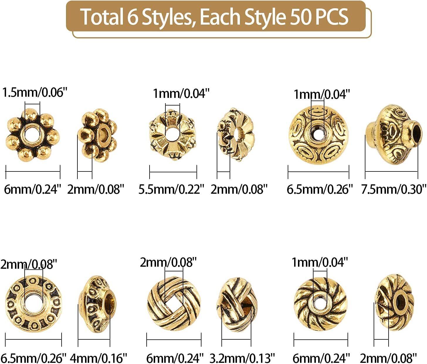 ✿サイズ:スペーサービーズ:6x3.2mm、穴:2mm、50個;スペーサービーズ:5.5x2mm、穴:1 mm、50個;スペーサービーズ:6x6x2mm、穴:1.5mm、50個;スペーサービーズ:6x2mm、穴:1mm、50個;スペーサービーズ:6.5x4mm、穴:2mm、50個;スペーサービーズ:6.5x7.5mm、穴:1mm、50個;保管容器:8x2cm、1個。