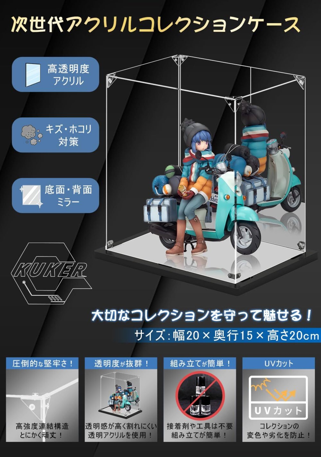 KUKERフィギュアケース アクリルケース UVカット コレクションケース ディスプレイケース 台座 背面ミラー 組み立て簡単 頑丈 汚れ防止 手袋 クリーニングクロス付き(20×15×20cm, 台座ミラー+背面ミラー)