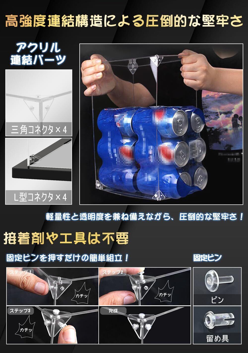 【組立簡単】固定ピンを押すだけの簡単取付、接着剤や工具は不要です。組み立て時に指紋や埃が付かないように手袋とクロスが付属、アクリル面をクリアに保つことが出来ます。アクリル板には剥がしやすい保護フィルムを採用、更にフィルム除去ツール付き。フィギュアケース全体を持ち上げても崩さない、展示物の出し入れが楽々。