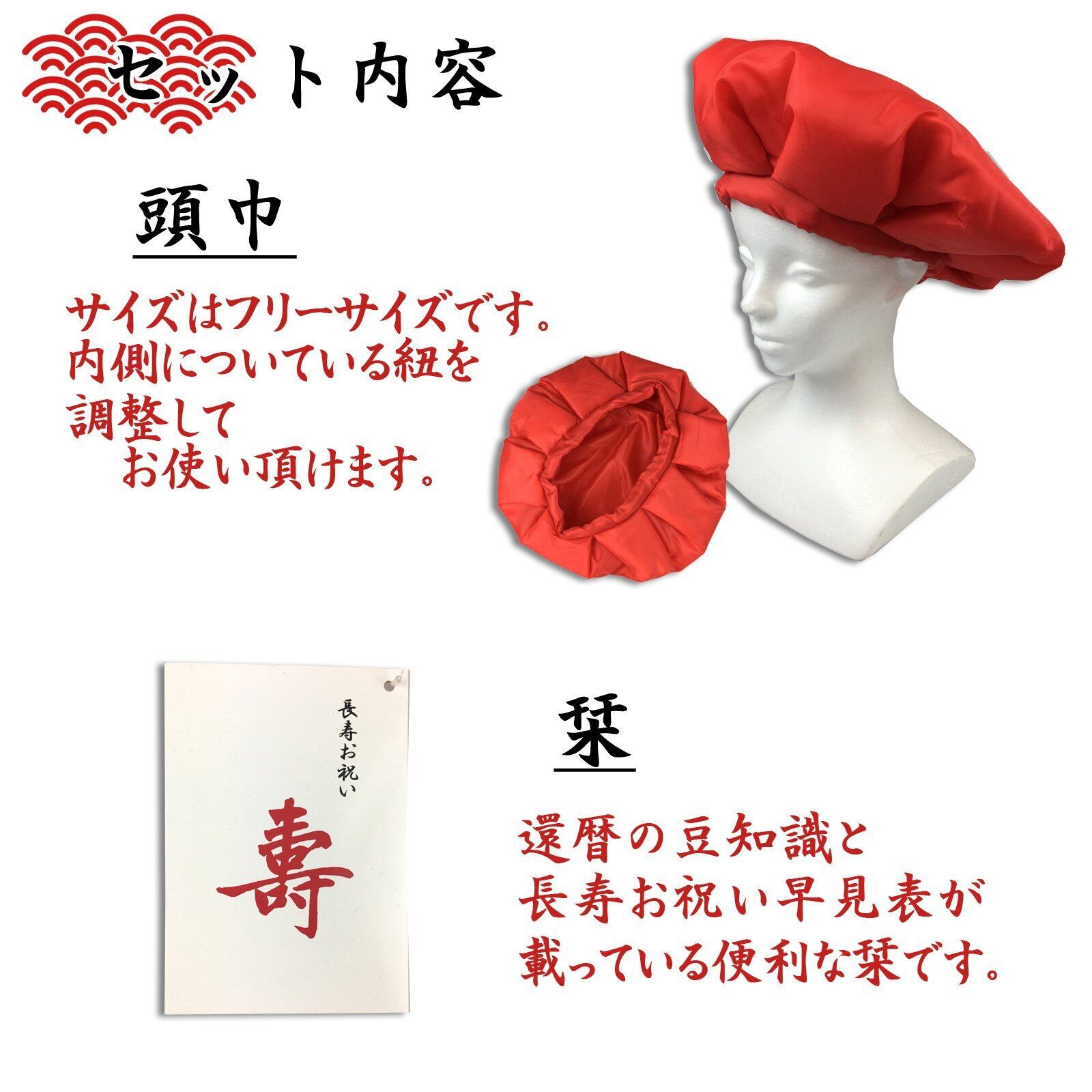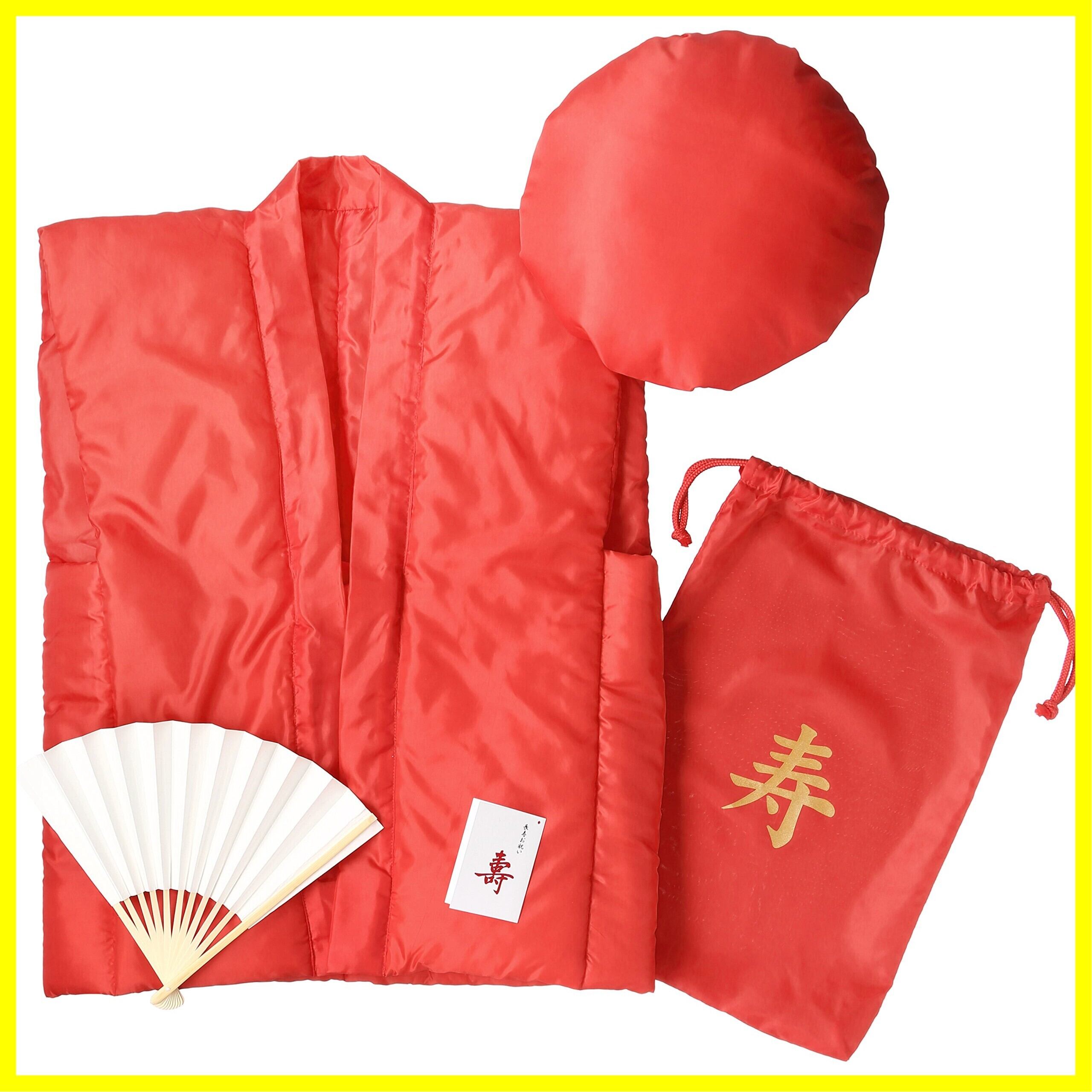 コトブキニッキ 祝着 還暦祝いご長寿5点セット(赤ちゃんちゃんこ 頭巾 祝扇子 化粧袋 栞) 赤 朱色 日本 F-(FREE サイズ)