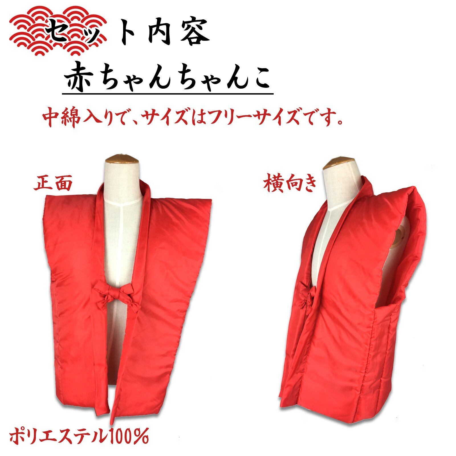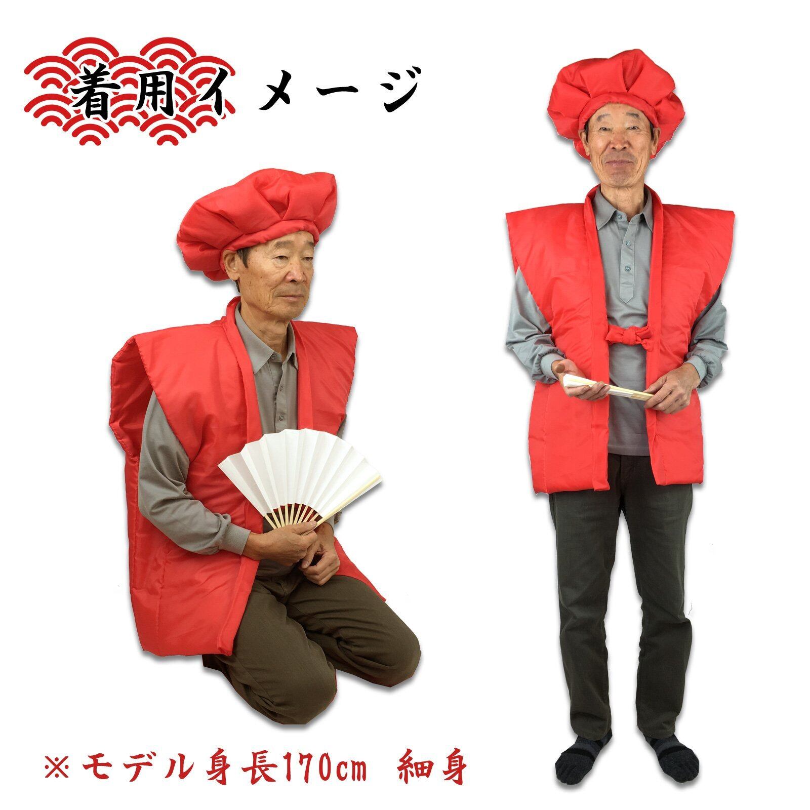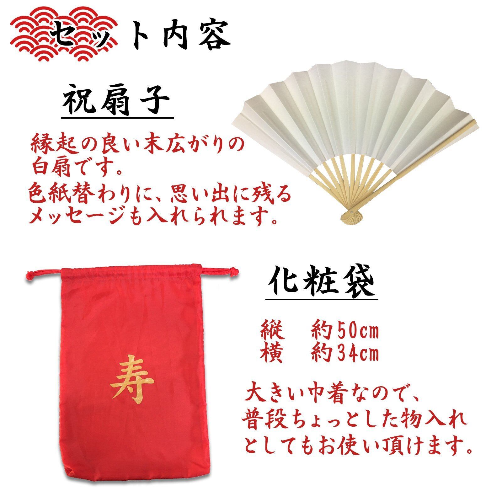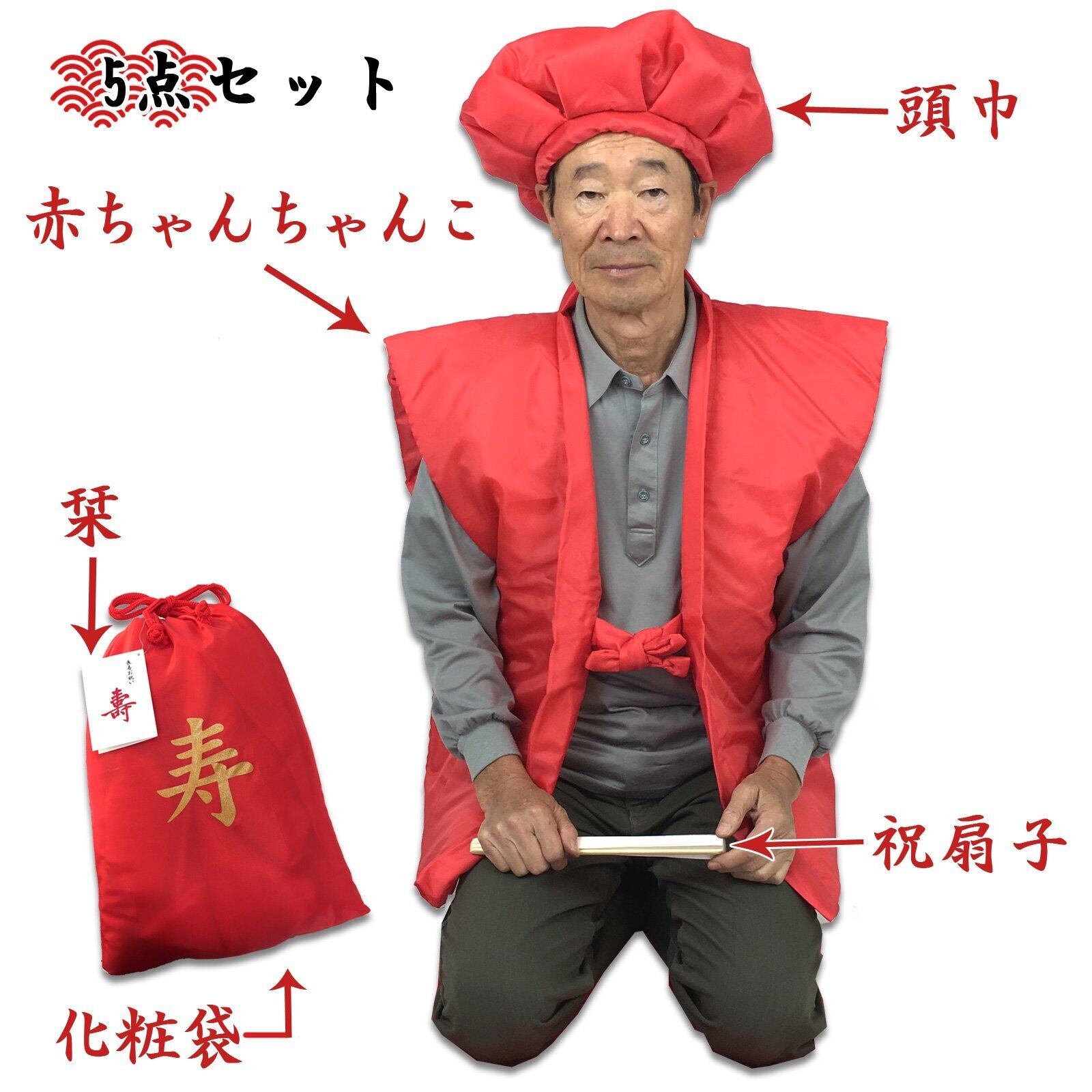 還暦のお祝いに必要なものが本セットで揃います。記念写真撮影用にピッタリです。1度しか使わないものですから手頃な値段で済ませたいお客様におすすめです。満60歳の還暦を迎える方へのお祝い品の定番、赤のちゃんちゃんこ(祝着)と頭巾、祝扇の3点に栞と化粧袋を加えた5点セットになります。ちゃんちゃんこはポリエステル100%の中綿入りです。袖がないので夏の暑い時期でも問題なく撮影にご使用いただけます。頭巾は紐でサイズを調節できます。深くかぶるのではなく軽くかぶせてお使いいただきます。祝扇には縁起の良い末広がりの白扇子をご用意いたしました。白無地になっておりますので、一言メッセージを添えてお渡しするのも一案です。また、還暦について簡単にご説明いたしました「御祝いの栞」も同封いたします。赤い共生地の巾着タイプの化粧袋に入れてお届けいたしますので、届いたらすぐにお渡しいただけます。本セットを着てみんなで記念写真を撮り、ご家族、ご友人との素敵な思い出作りにお役立てください。