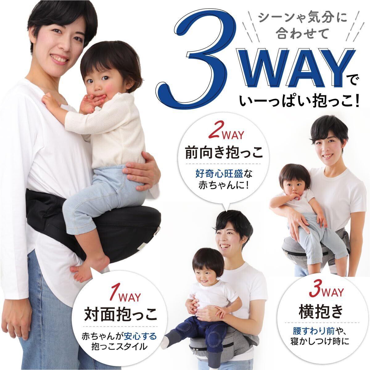 【赤ちゃんと一緒にもっといろんなところへ出掛けたい!】電車やバスなどの移動時や、荷物が増えるお買い物、お散歩はもちろん、イベントや旅行など、さまざまなシーンでお使い頂けます。アクティブなお出かけはもちろん、赤ちゃんがおねむモードの時も◎!赤ちゃんと密着できるので、お母さんのぬくもりを感じながら、安心して眠れます「抱っこ!」「降ろして!」のわんぱく赤ちゃんにもオススメです! 【対象年齢】3カ月~ 【推奨耐荷重】20kg【サイズについて】ウエスト60cm~110cm対応可能 *帝王切開でご出産されたお客様へ:ヒップシートは構造上、下腹部に一定の力がかかる仕様になっております。お子さまの重みで下腹部の痛みが生じる場合がございますのでご注意ください。