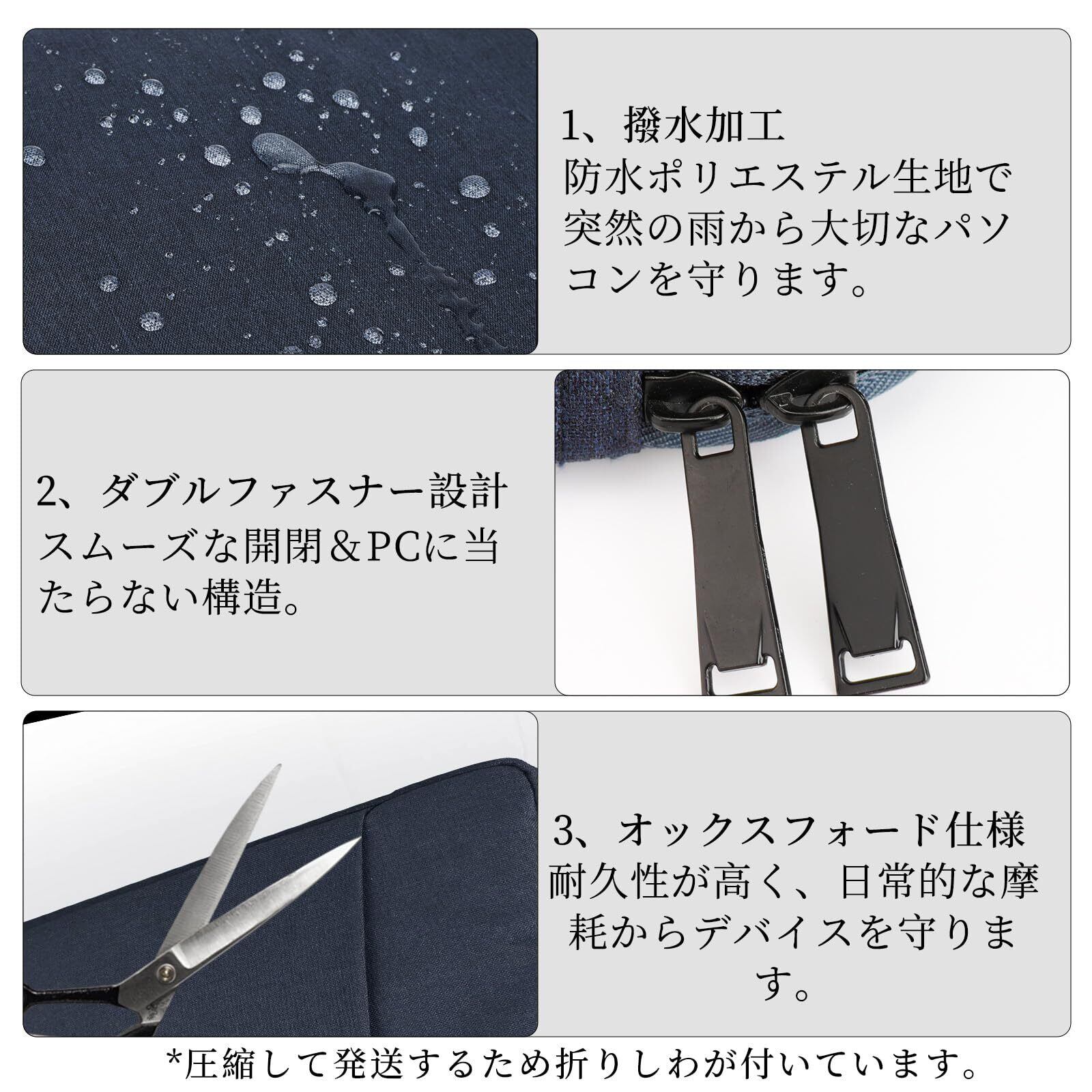 〖3層構造の全面保護〗 ・内側:ソフトベルベット生地でスクラッチ防止 ・中間:衝撃吸収クッション層 ・外側:高密度オックスフォード生地(耐摩耗/耐水) ▶精密縫製で長期使用に耐える耐久設計