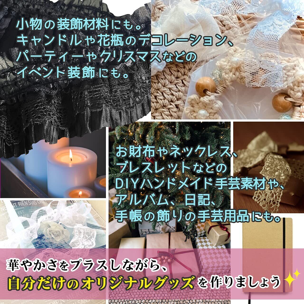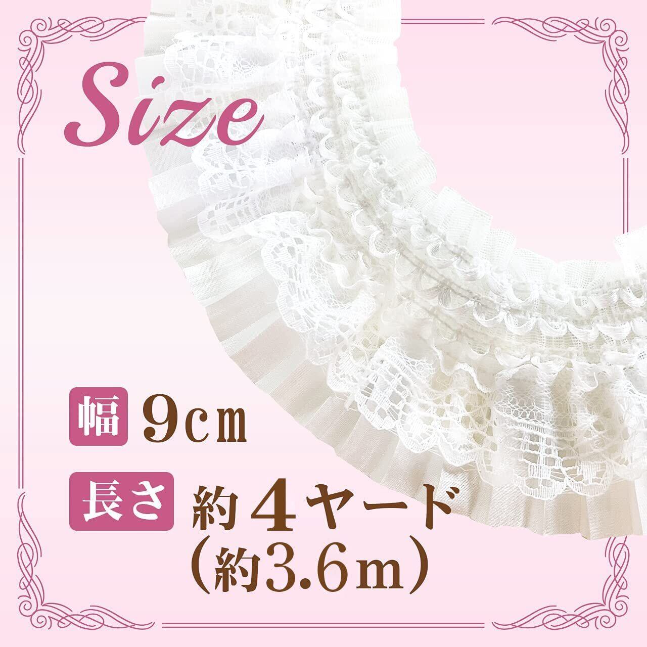 "· 贅沢にフリルやチュール、ギャザーが組み合わされた手芸用レースリボンです。幅広タイプ(8cm幅)のレース生地で、上品に華やかさをプラスします。 · スカートの裾、ドレス作り、シャツの袖などに。衣装だけでなく、帽子やカーテン、ヘッドアクセサリー、ギフトラッピングなどのリボンにもお勧めです。 · 小物の装飾材料にも。キャンドルや花瓶のデコレーション、パーティーやクリスマスなどのイベント装飾にも。 · お財布やネックレス、ブレスレットなどのDIYハンドメイド手芸素材や、アルバム、日記、手帳の飾りの手芸用品にも。華やかさをプラスしながら、自分だけのオリジナルグッズを作りましょう。 · 幅:約9cm 長さ:約4ヤード(約3m60cm)