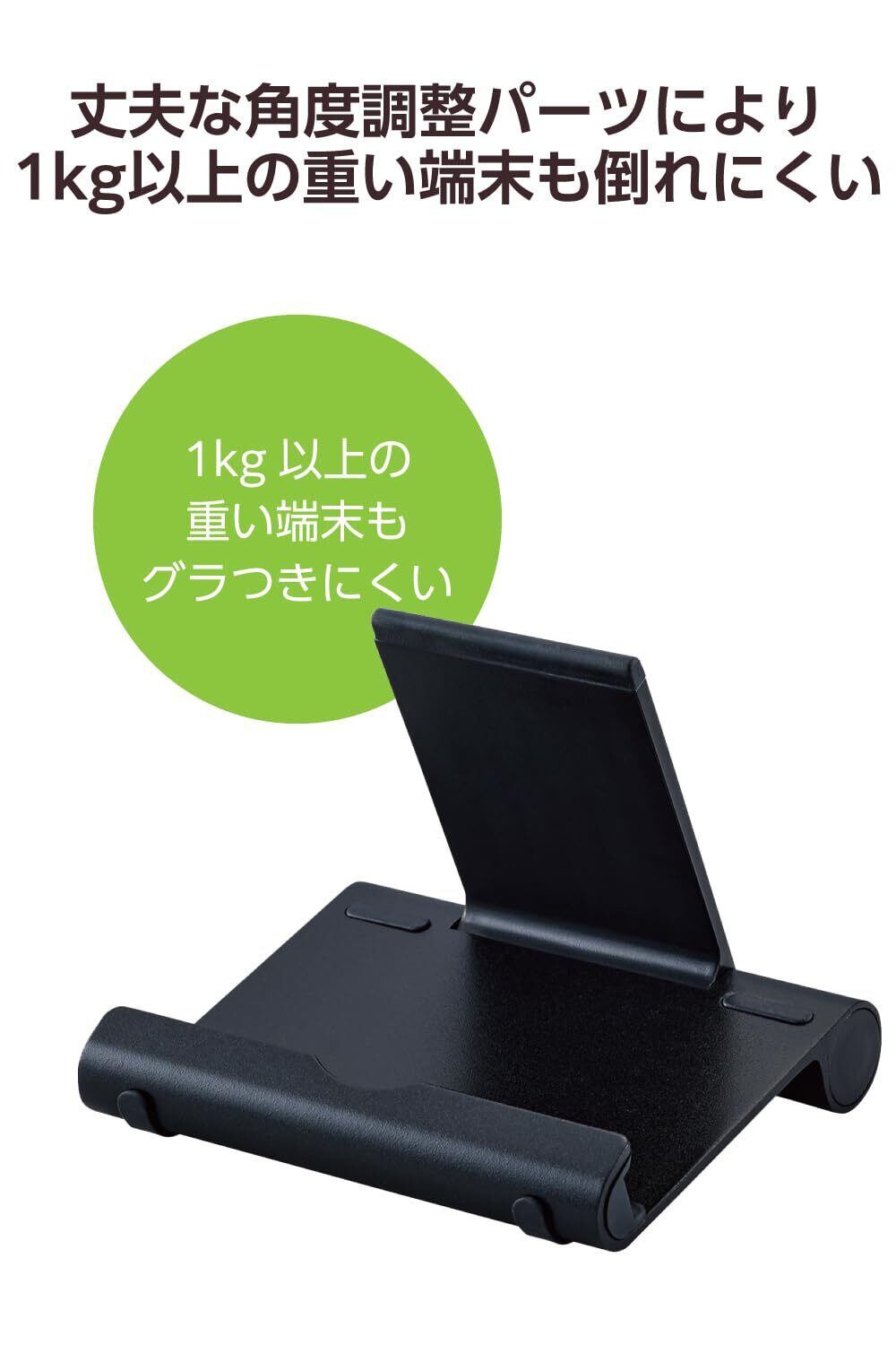 ■丈夫な角度調節パーツにより、1kg以上の重い端末を置いてタップしても角度が変わったり、倒れたりしません。