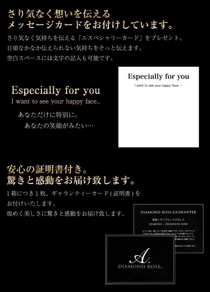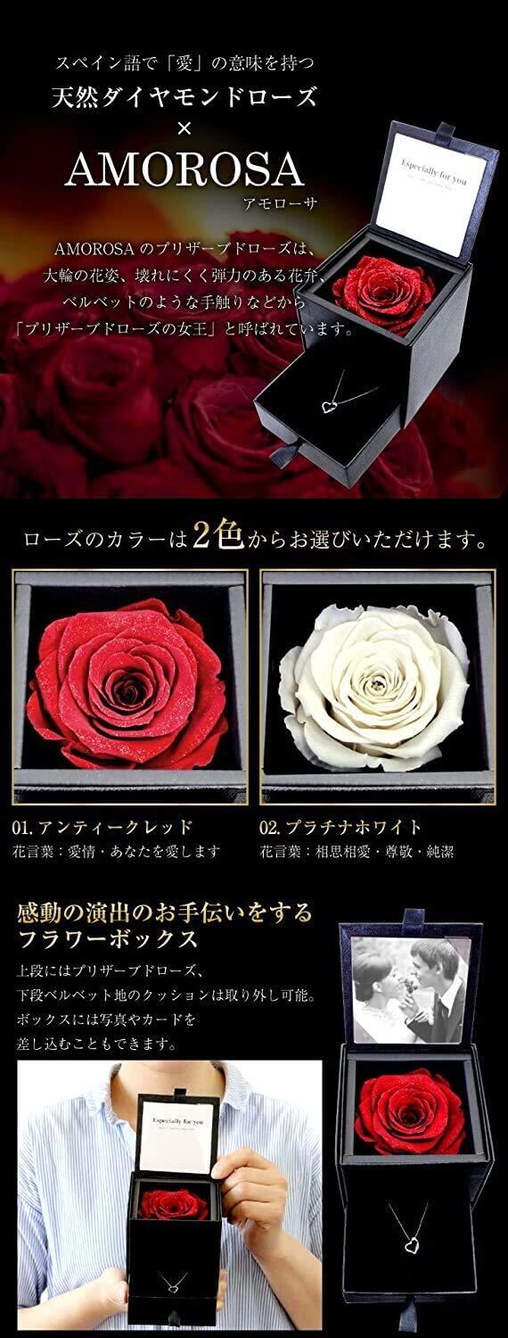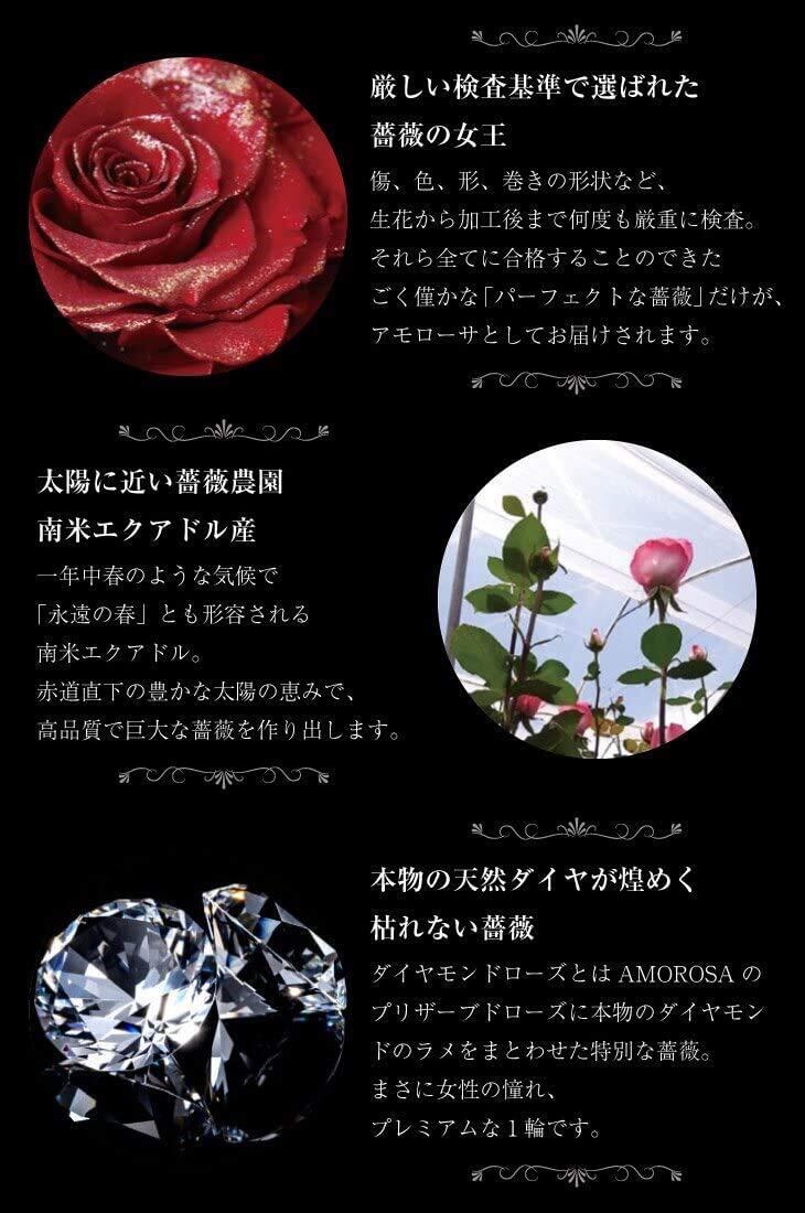 ダイヤモンド煌めくプレミアムローズが添えられたリングケースAMOROSAのプリザーブドローズは、大輪の花姿、壊れにくく弾力のある花弁、ベルベットのような手触りなどから「プリザーブドローズの女王」と呼ばれます
