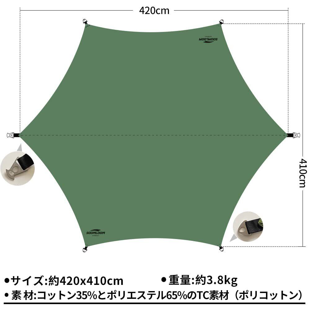 Soomloomヘキサタープ4.2mx4.1m 焚き火可 ポリコットンTC ファイアプレイス 遮熱性/耐火性/耐水性優れ サンシェード アウトドア