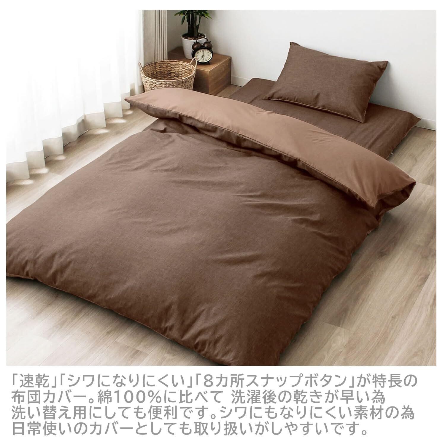 「速乾」「シワになりにくい」「8カ所スナップボタン」が特長の取り扱いがしやすい布団カバー。綿100%に比べて 洗濯後の乾きが早い為 洗い替え用にしても便利です。またシワにもなりにくい素材の為 取り扱いがしやすいです。ご家庭で洗えるのでいつでも清潔にお使い頂けます。
