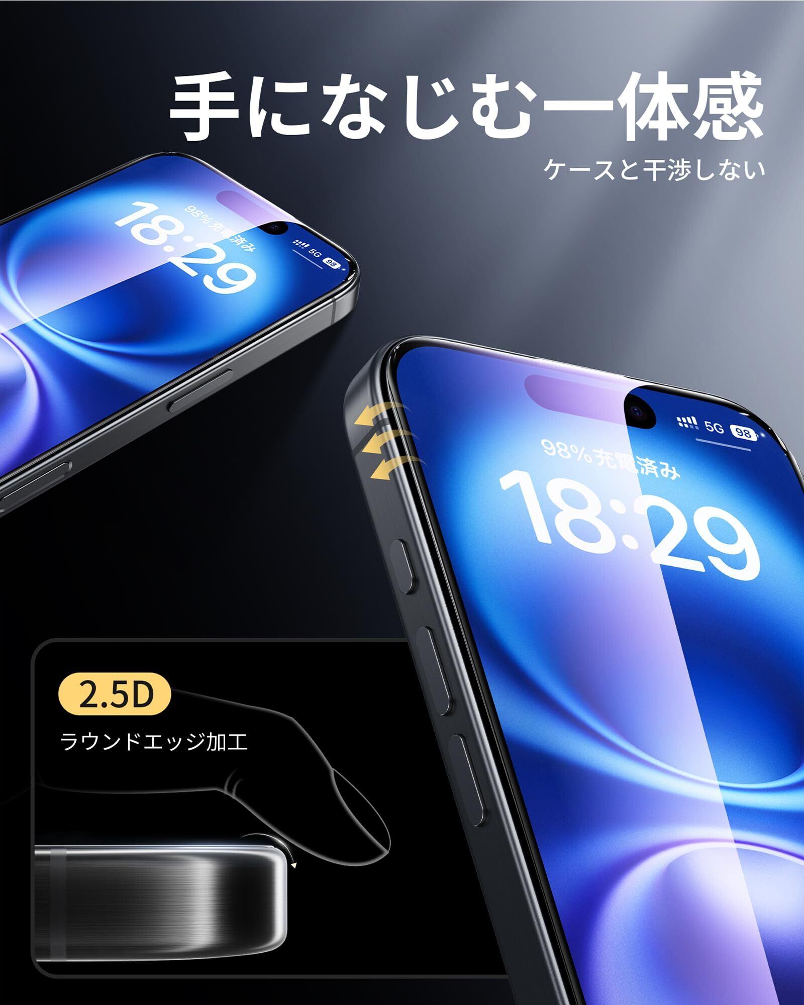 「ブルーライトカット・目の疲れ軽減」ブルーライト反射技術によりブルーライトを大幅にカットでき、目の疲労を緩和し、視力を保護します。長時間いPhone16の画面を見たり、ゲームをしたりする方におススメです。(ご注意:ブルーライトカット加工で、使用角度や環境によって、淡い黄色や薄い紫色に見える場合があります。予めご了承下さい。)