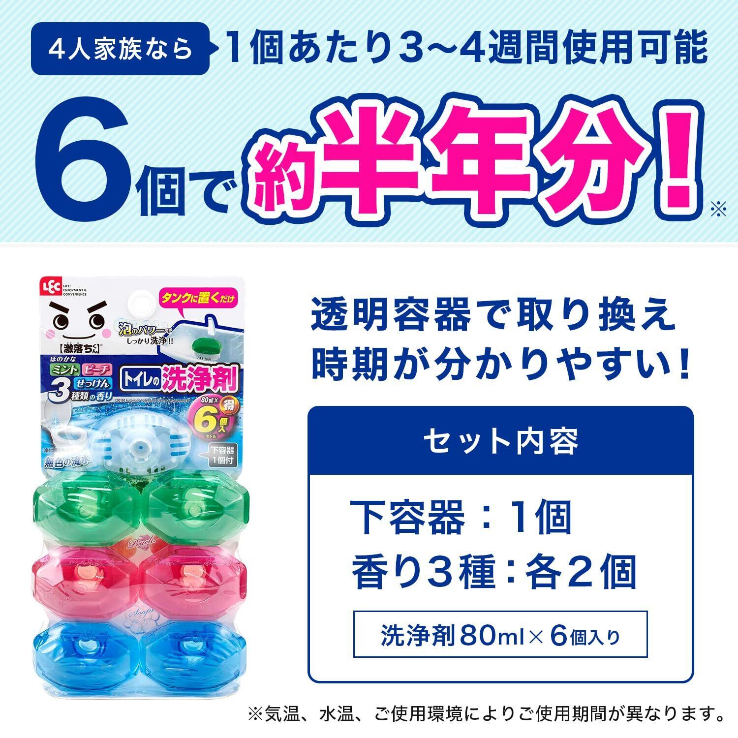 激落ちくん レック(LEC) タンクにポン トイレの洗浄剤 80ml (本体+ボトル6個付き) ミント・ピーチ・せっけん 3種の香りアソート 無色