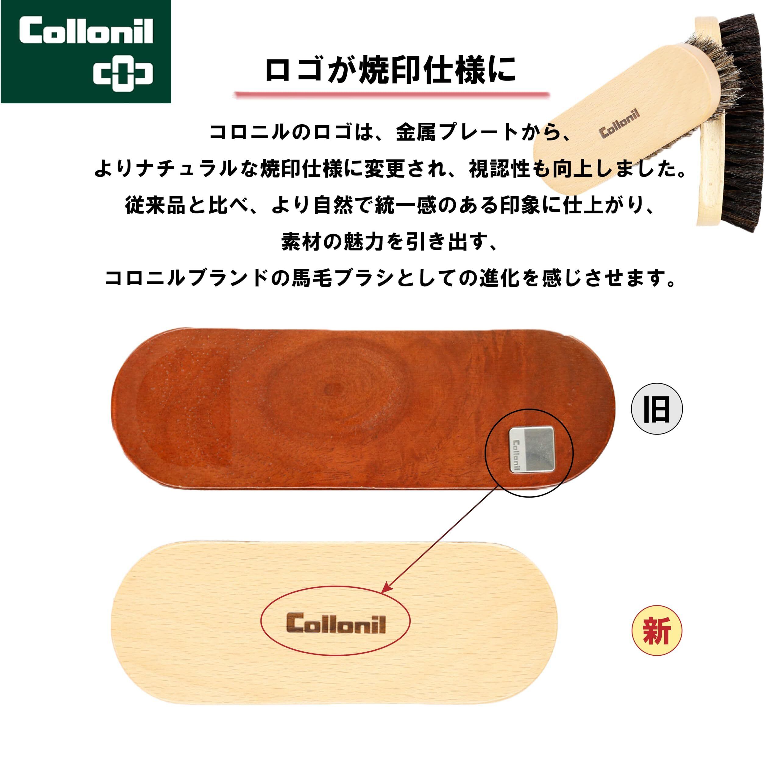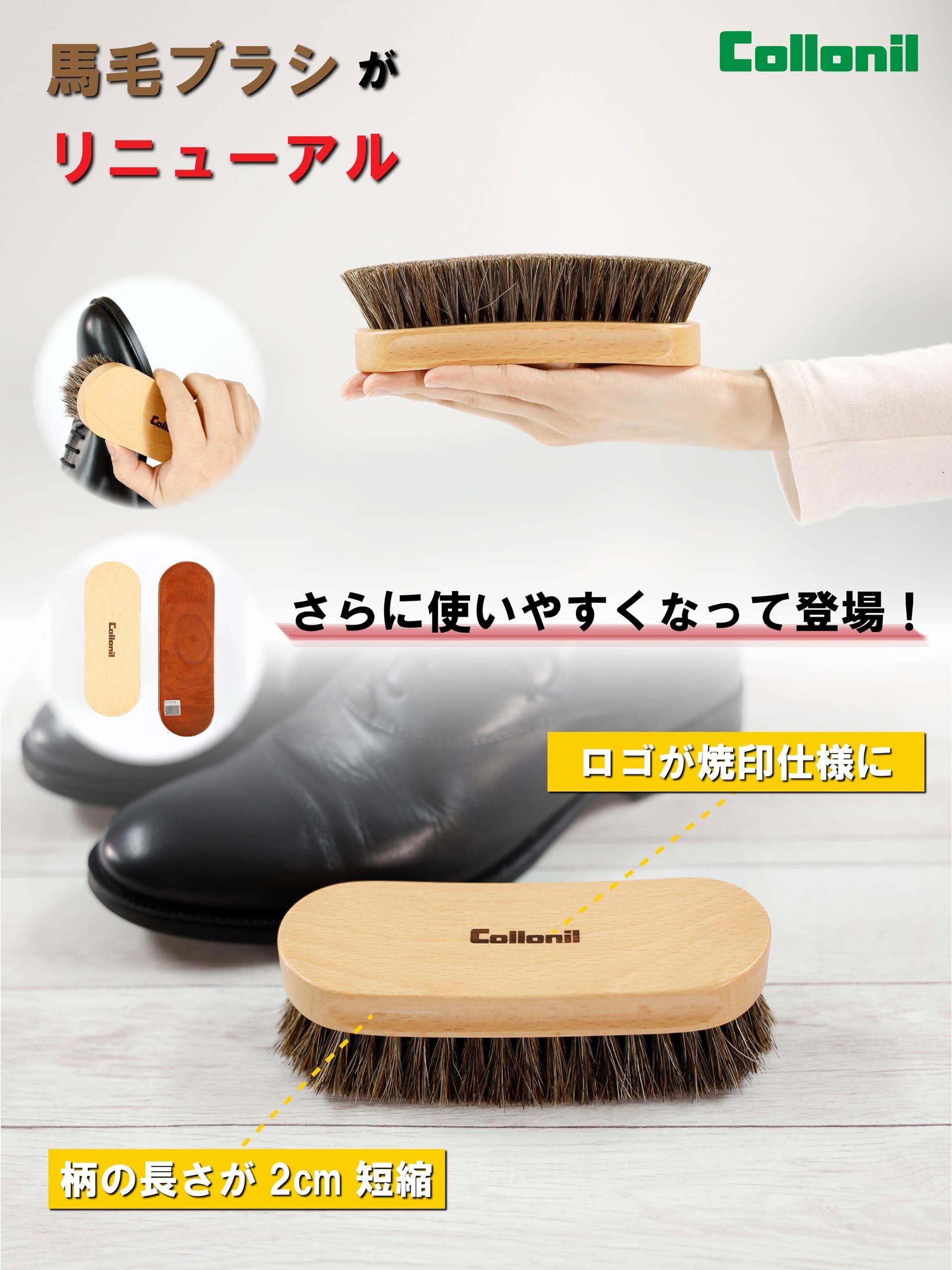 【長らく愛されてきたコロニルの馬毛ブラシが、新しいデザインで登場しました】レザーケアをはじめお手入れの必需品をして広く愛用されてきたコロニルの馬毛ブラシがリニューアルいたします。基本的な商品設計は踏襲しつつ、お客様からのご意見を踏まえ使いやすさを考慮し、柄をどなたでも持ちやすいサイズに見直しました。毛の長さや柄の幅はそのままに、柄の長さだけを2cm短縮し、扱いやすさを向上させております。ブナ材の柄には指が掛けやすい溝や、自然なブラッシングがしやすいカーブ設計が施されています。塗装は、使うほどに味わいが増すナチュラルな塗装に見直しました。