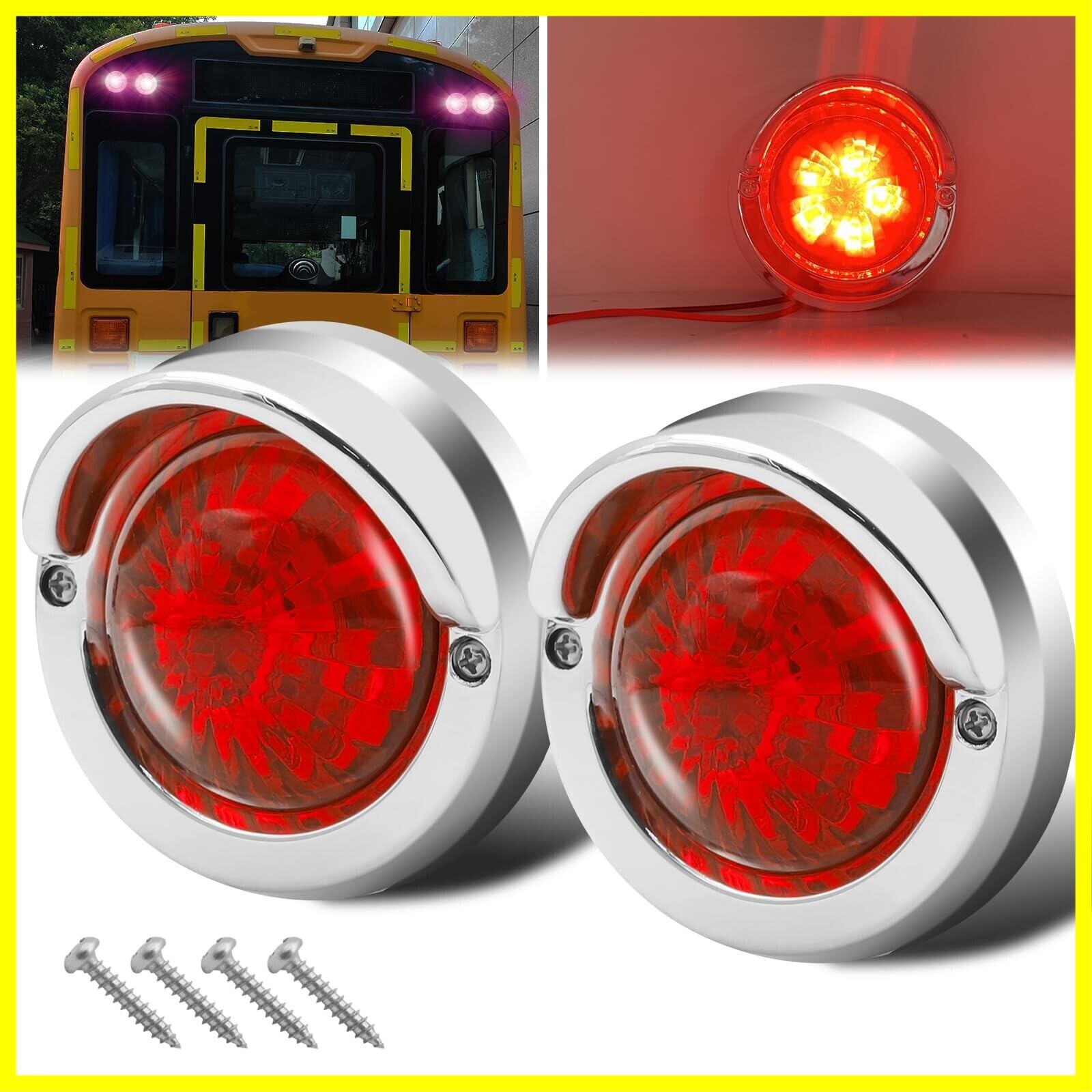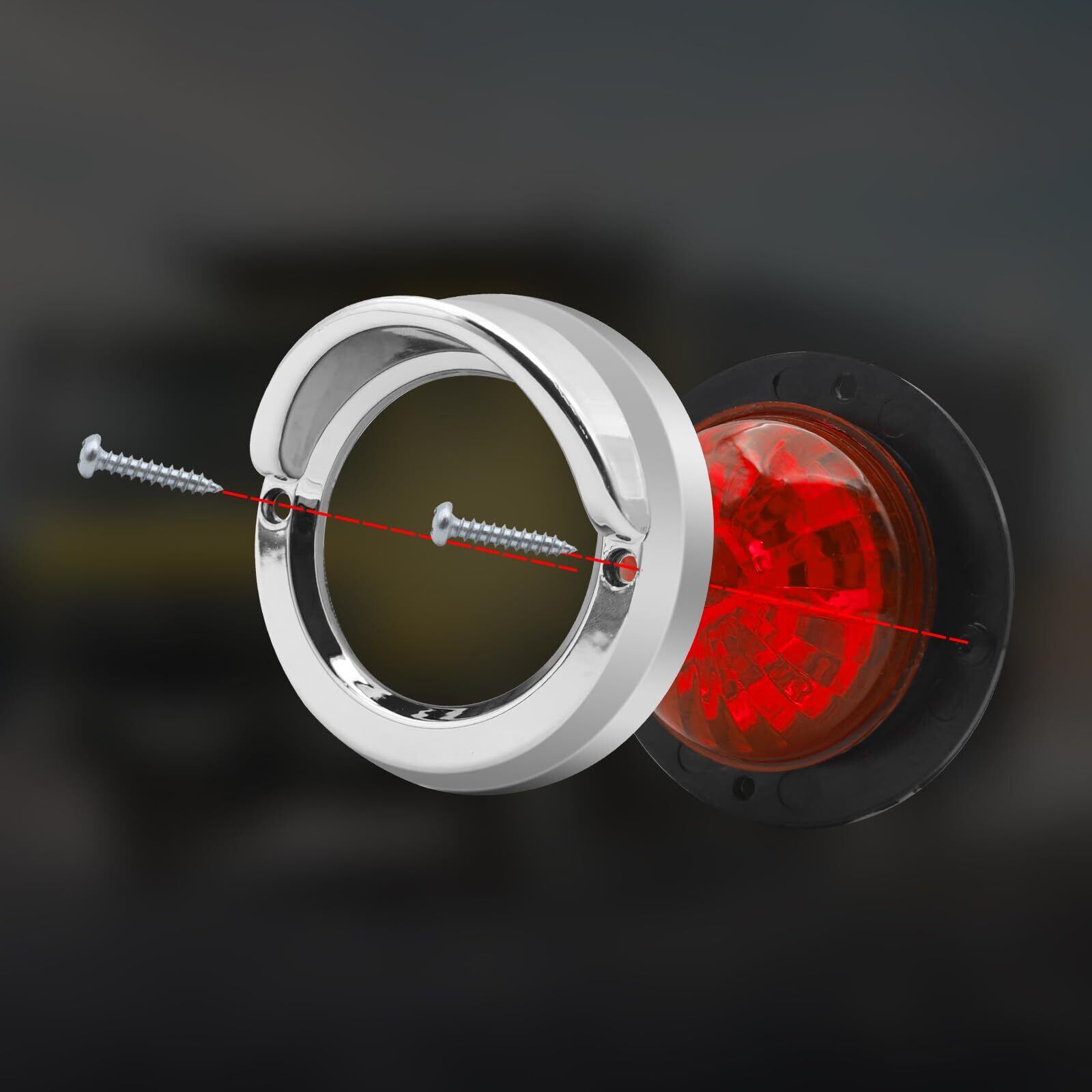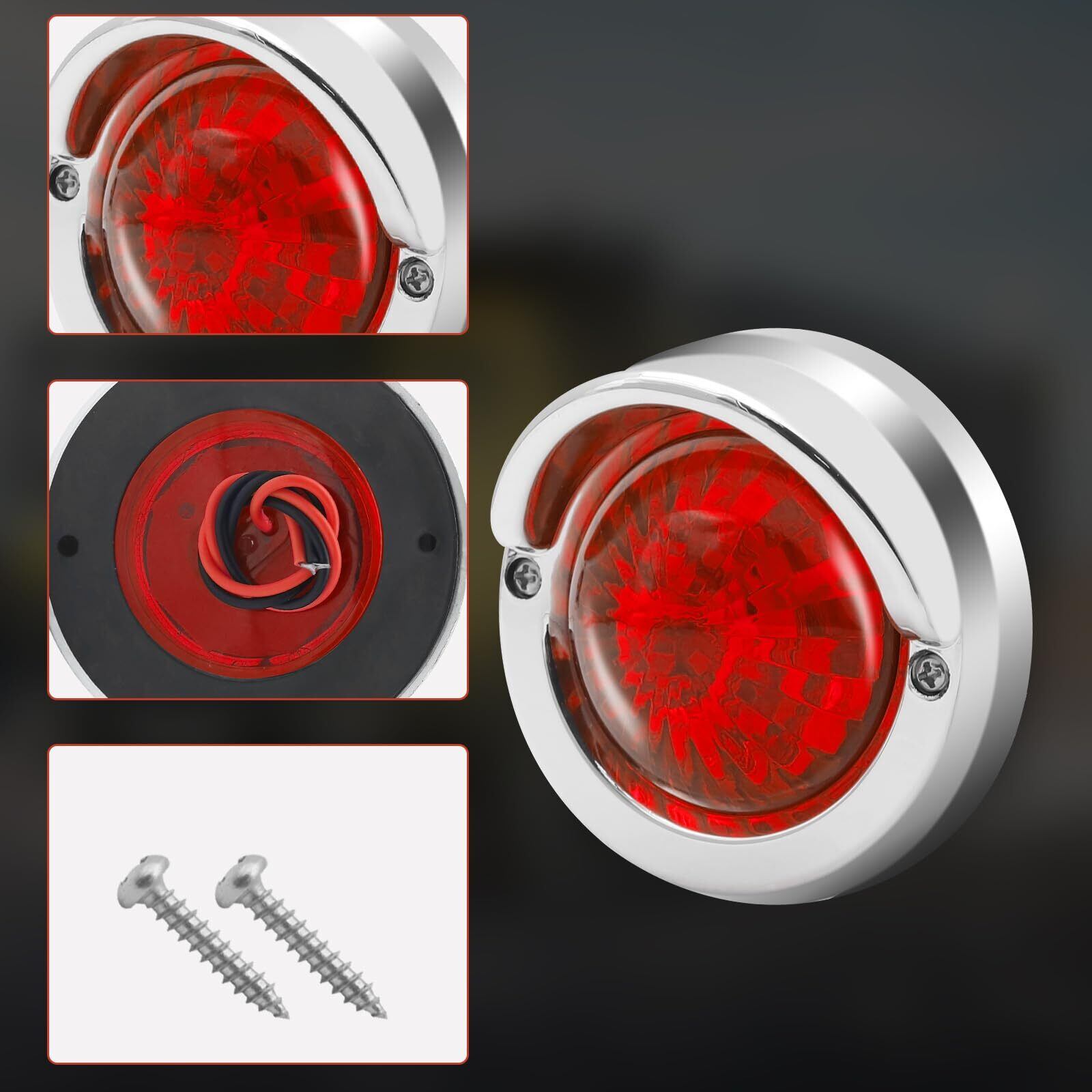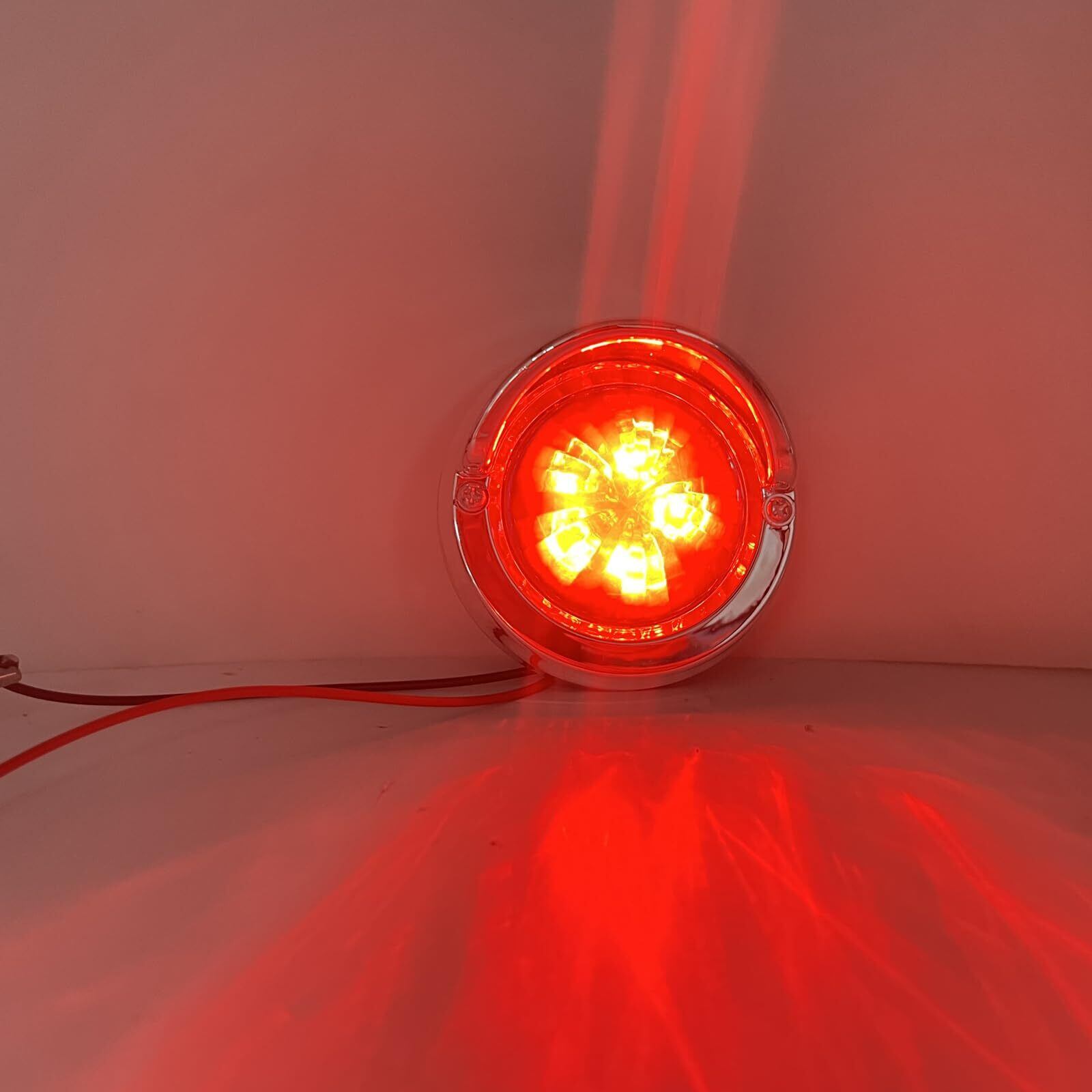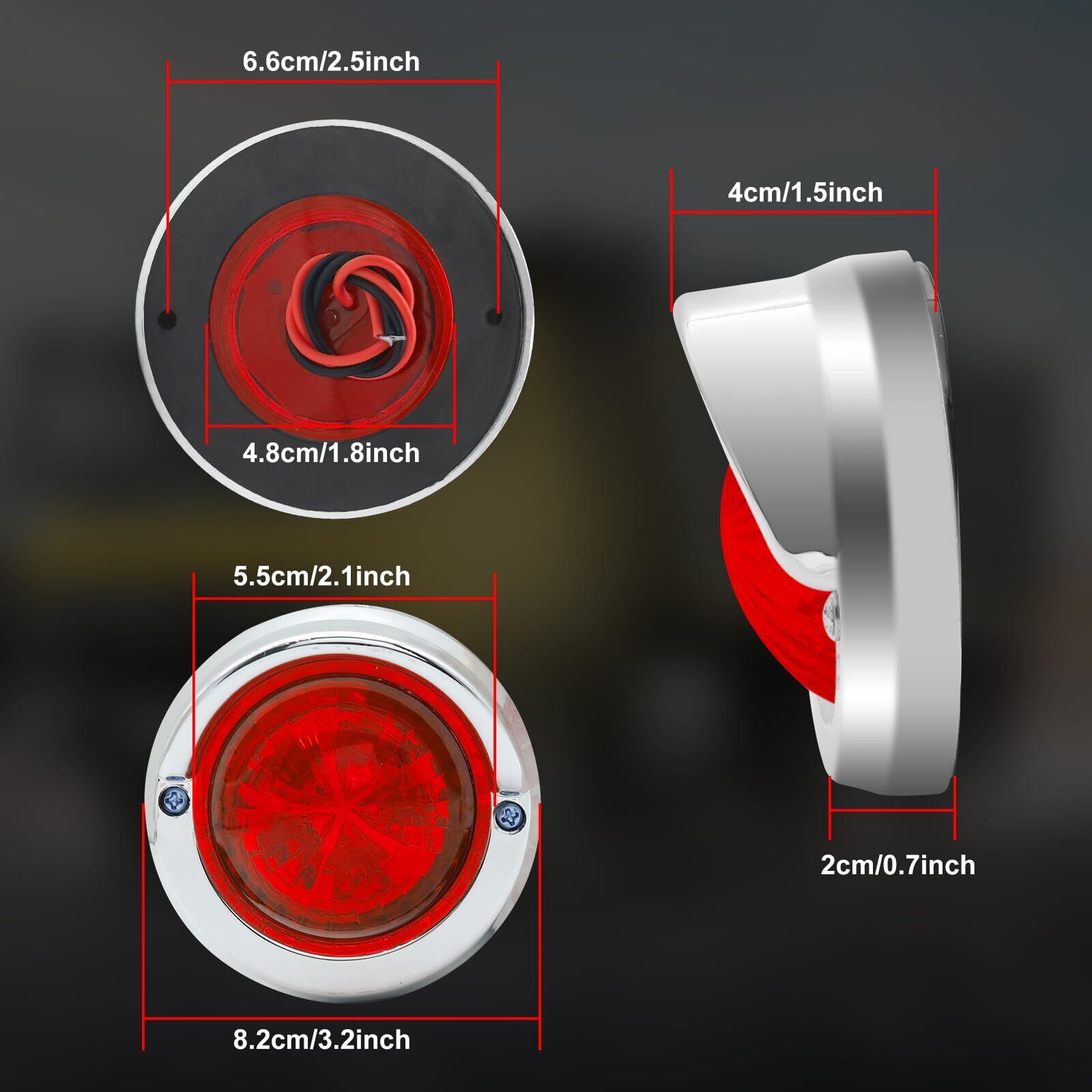 ✦【マーカーランプ仕様】サイズ(約):横 82 mm × 縦 82 mm × 奥行 40 mm レンズ幅 55 mm ◆発光色:赤色 ◆本体色:シルバーフレームと赤いレンズ ◆動作電圧:DC24V ◆材質:ABS樹脂ボディー+メッキフレーム+LED ◆2本配線:“+”が赤い線、“-”が黒い線 ◆入数:2個セット