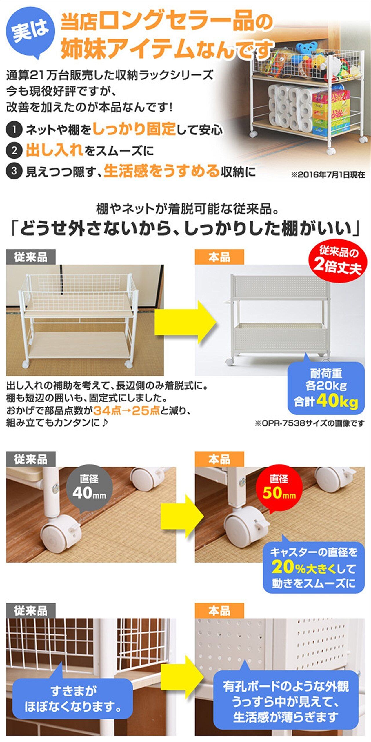 ●クローゼットの服の下や押入れ下空間を有効活躍する、キャスター付きの収納ラック●お客様からのご意見を基に、出し入れのしやすさや日々の使い勝手を改良したロングセラーモデルをリニューアル●目隠しパネル&すき間の少ない放り込む収納で、外に出てもおもちゃ入れにも最適●押入れなどの段差でも出し入れしやすいよう、従来より大きくなったキャスターと取っ手●囲いの長側面側はすべて着脱可能(高さ15cm)●キャスター4個付き(直径50mm、うちストッパー付き2個)●組立品(組立時間:約20-30分)
