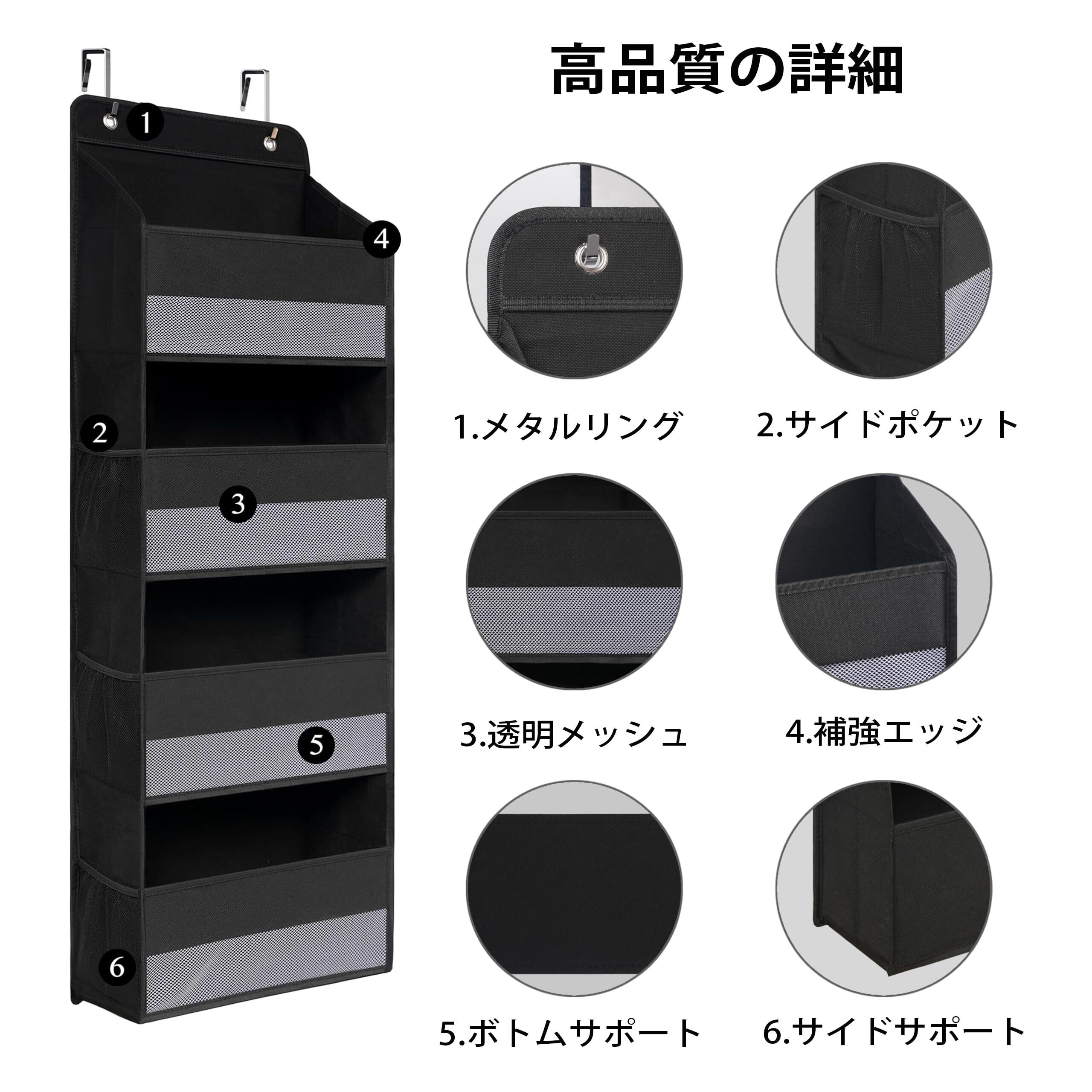 ウォールポケット 【2025新型】 ドア掛け 壁掛け 収納ポケット 4段 吊り下げ収納ポケット 大容量 不織布 頑丈 メッシュ窓 おむつ タオル 化粧品 おもちゃ 漫画 収納 弾性フック2個付き (ブラック)