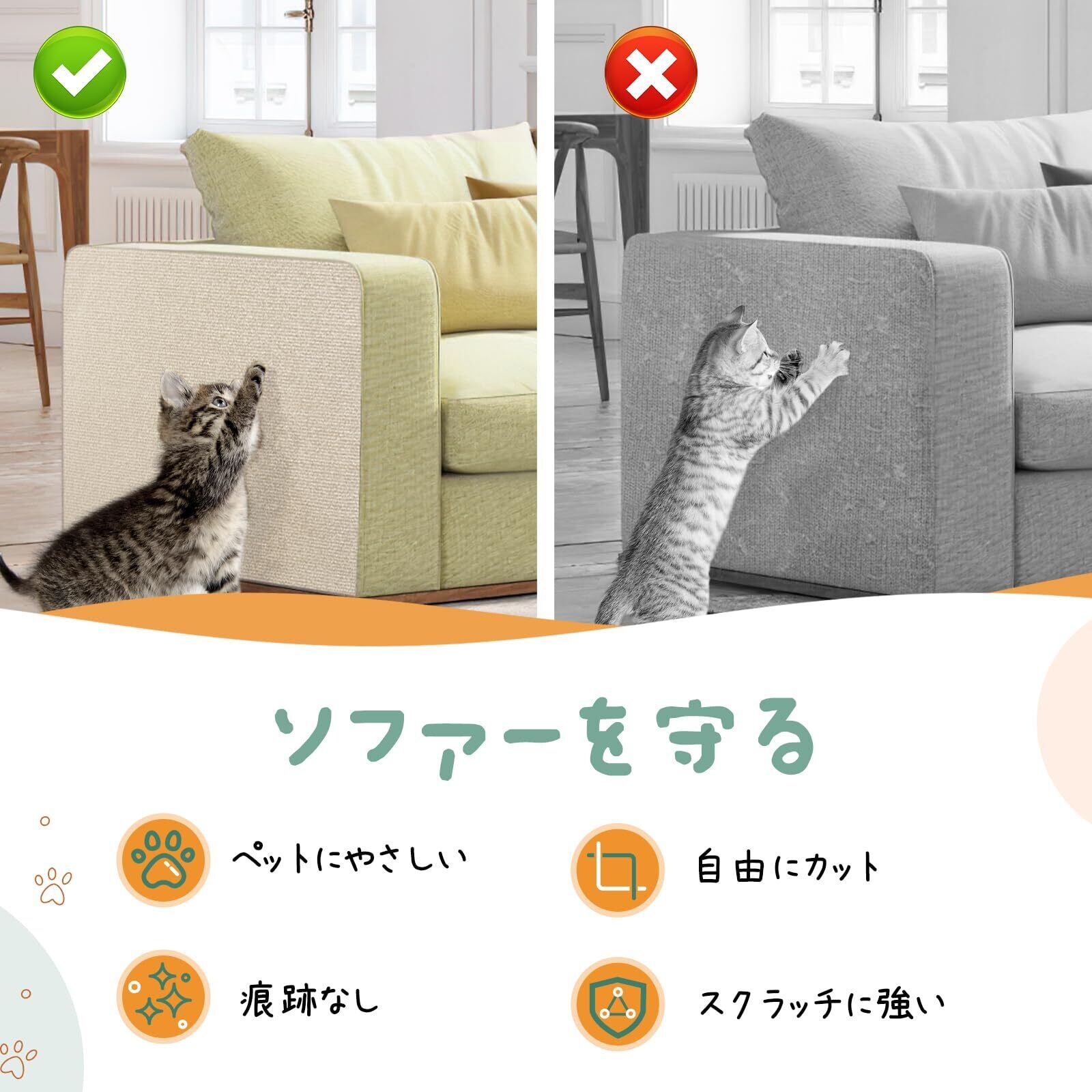 「多種の場所に適用」 自由にカットできるため、本製品は様々の場所に使用できます。例えば壁、布/木製ソファー、戸棚、タンスなどネコちゃんが爪とぎしがちな場所に適用します。更に、キャットタワーなどのリペアにも使えます。ご注意:革、ベルベット、マイクロファイバーの表面、または特殊塗装加工された表面には適用しません。