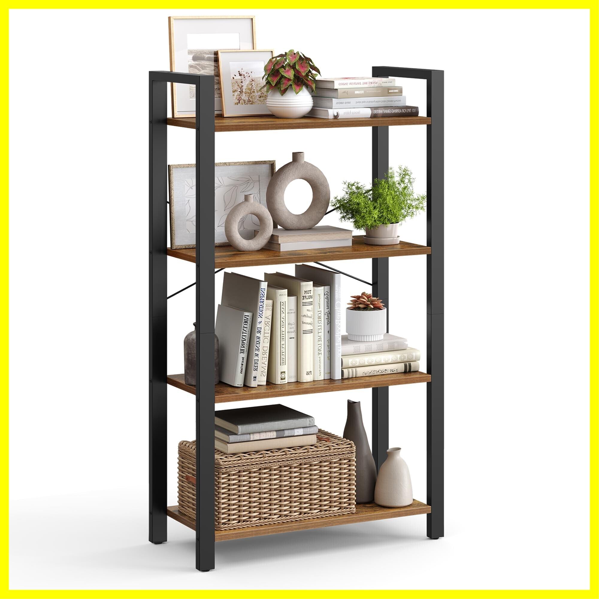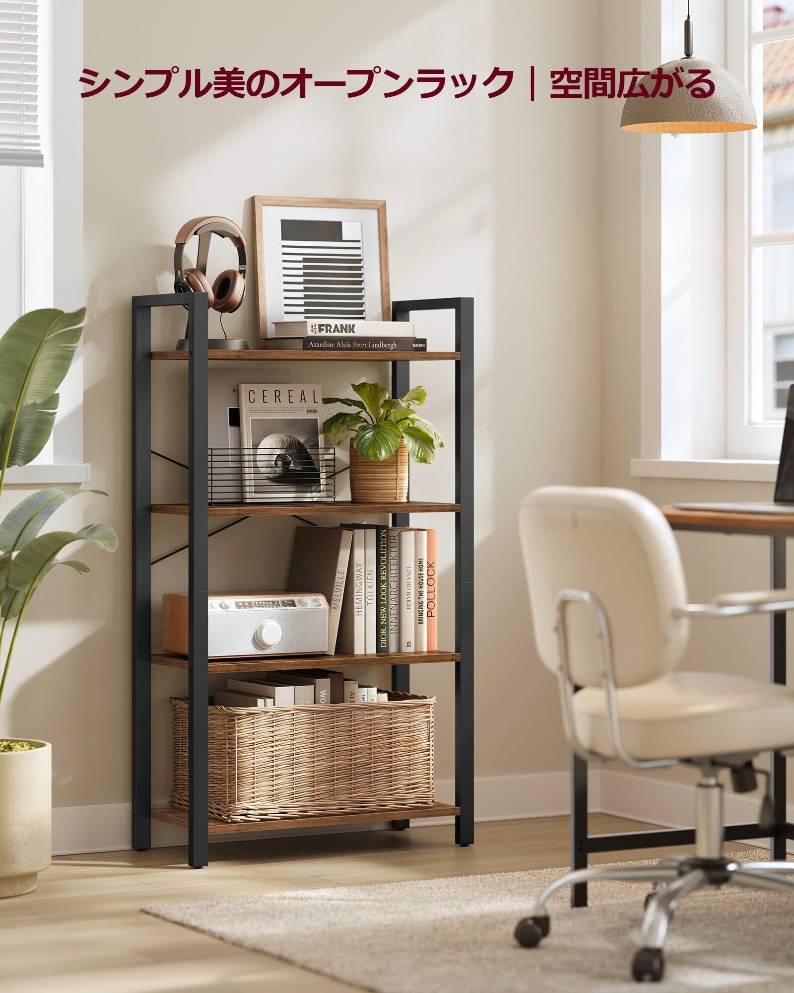 VASAGLE オープンラック ディスプレイラック 木製 4段 木目天板 スチール脚 幅66×奥行30×高さ120㎝ 耐荷重40㎏ ヴィンテージ 木目調 LLS60BX