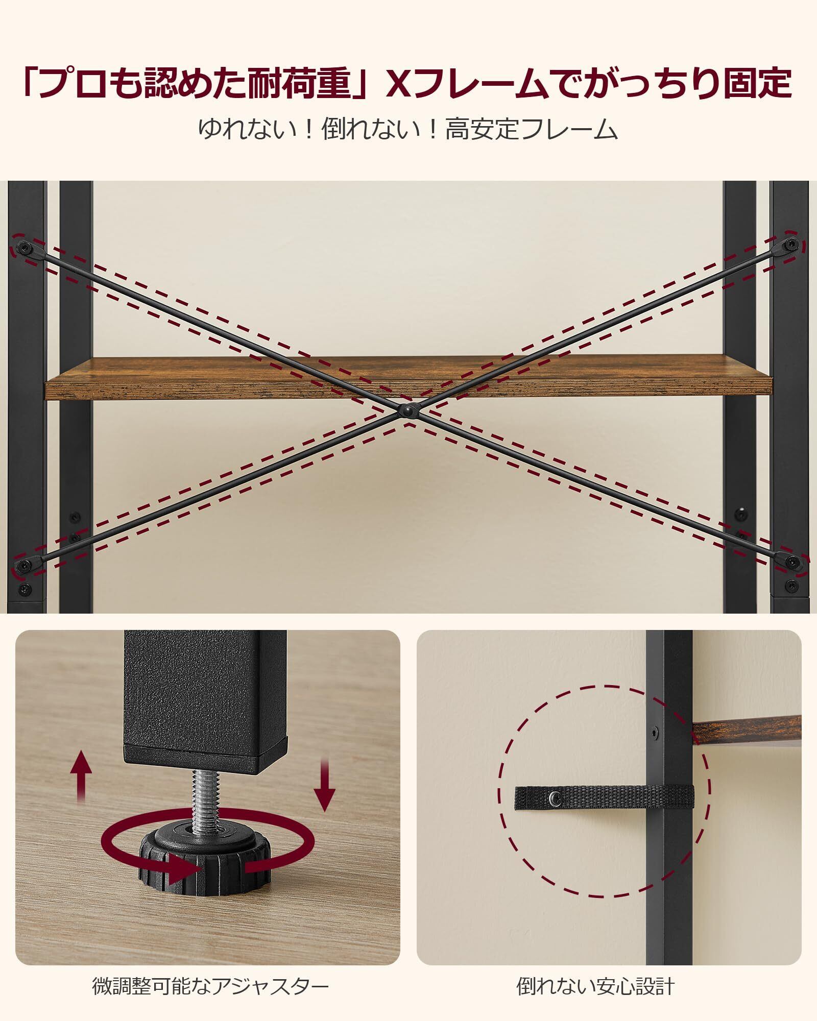 【頑丈なフレーム】細身の金属製骨組みは安定感があり、棚あたり10Kgまで耐えられます。脚部にアジャスター付き、足の高さを微調整できるので、平らでない場所でも安定します
