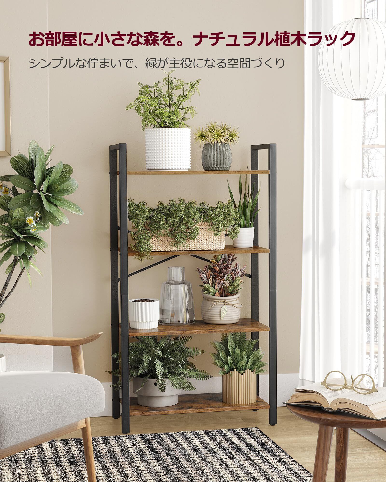 【シックなデザイン】ブラックのフレームと木目の組み合わせが落ち着いたアメリカンヴィンテージな雰囲気を演出してくれます。 各面から開放感があり、お部屋も広くて明るく感じられる物置シェルフです