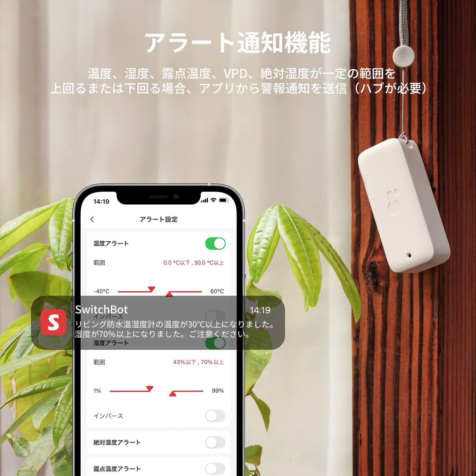 【遠隔確認 & 温湿度異常アラー通知機能】SwitchBotハブミニ/ハブ2と併用すれば、旅行中でもお家の温湿度環境を確認できます。また、温度、湿度、露点温度、VPD(飽和水蒸気圧)、絶対湿度が予め設定した値以上または以下になった場合はアプリでアラート通知を受け取ることができます。