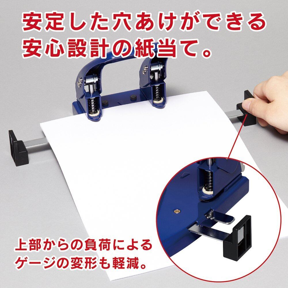 ワイドダブルゲージで用紙の中央合わせが簡単にでき、1度に大量に穴をあけられる2穴パンチ