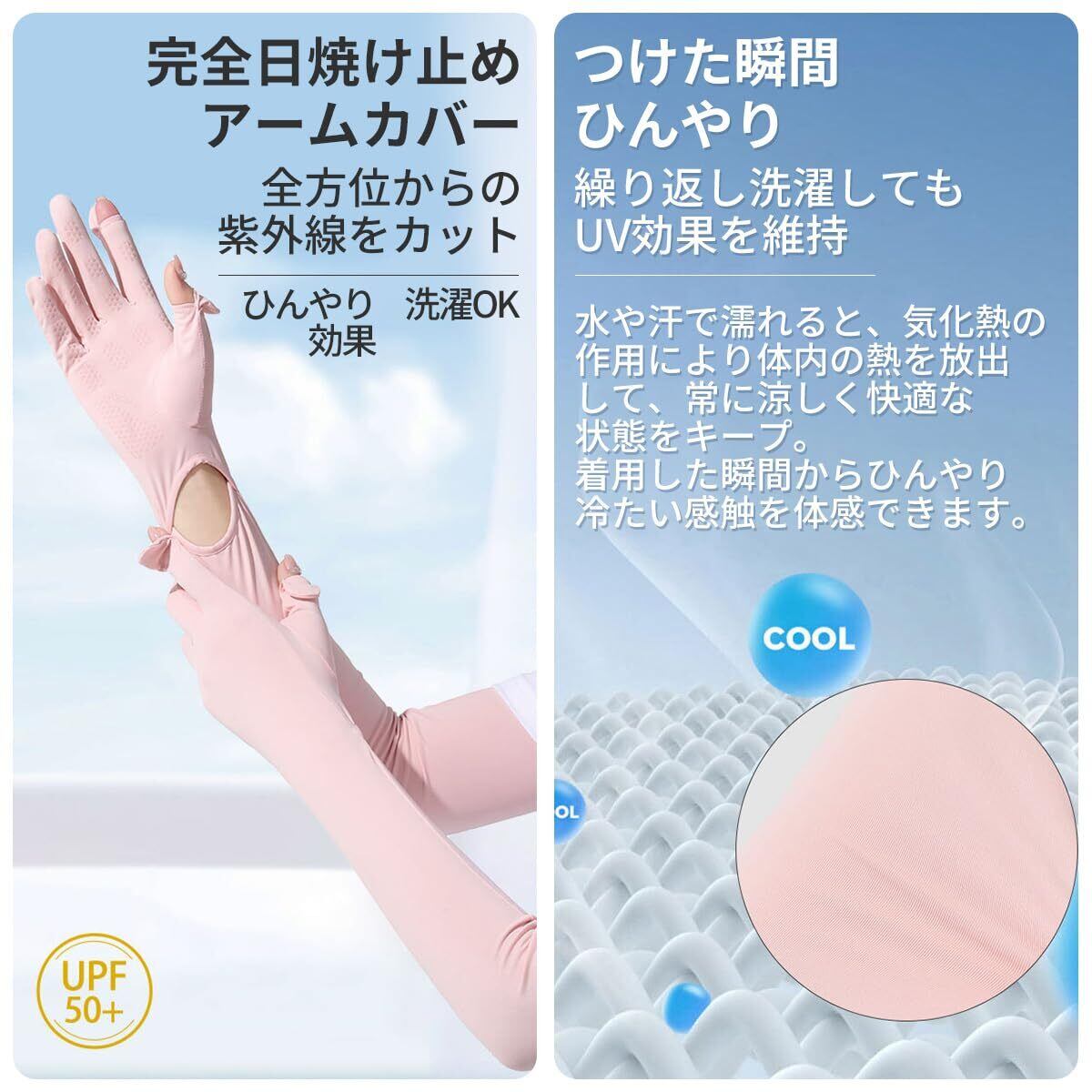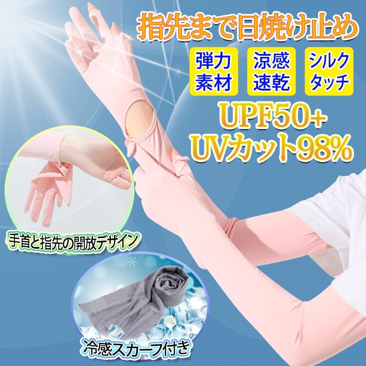 【UV対策と一緒に使える「冷感スカーフ」付き】(サイズ:80×15cm)。水に浸して振るだけでひんやり快適。 【指先までしっかり日焼け止め】 絶対に日焼けしたくない人におすすめ。指先までしっかり日焼け止めができます。指先~手のひら~肩下までしっかり覆えるロング丈なので、Tシャツと合わせて腕全体の日焼け対策が簡単にできます。