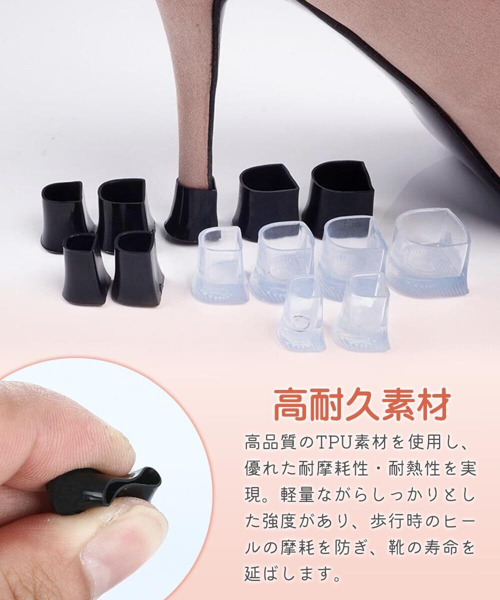 【優れた耐久性】高品質TPUを使用し、耐摩耗性・耐熱性に優れたヒールキャップを実現。軽量ながらしっかりとヒールを保護し、歩行時の摩耗や傷を防ぎ、靴の寿命を延ばします。