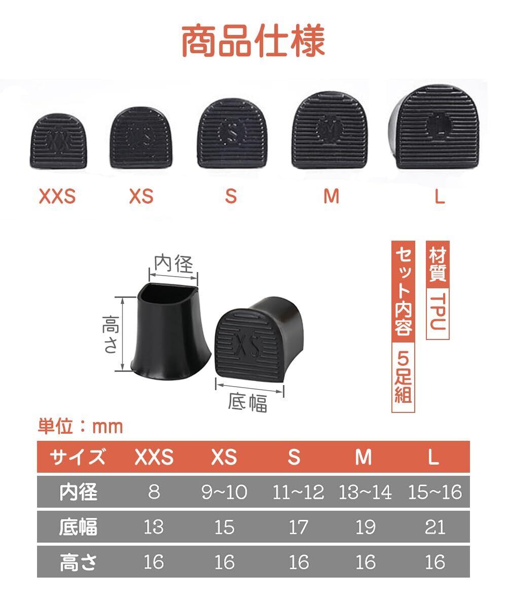 XXS、XS、S、M、Lの5サイズをご用意しております。サイズごとのご購入も可能で、さまざまな靴にフィットし、異なるシーンでの保護ニーズに対応します。