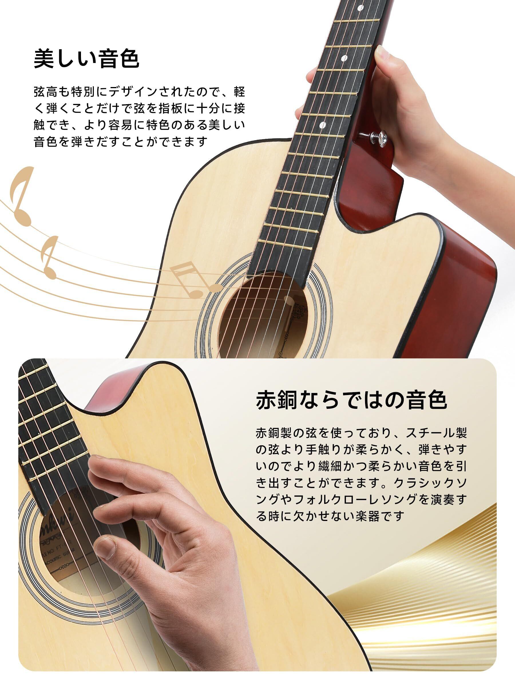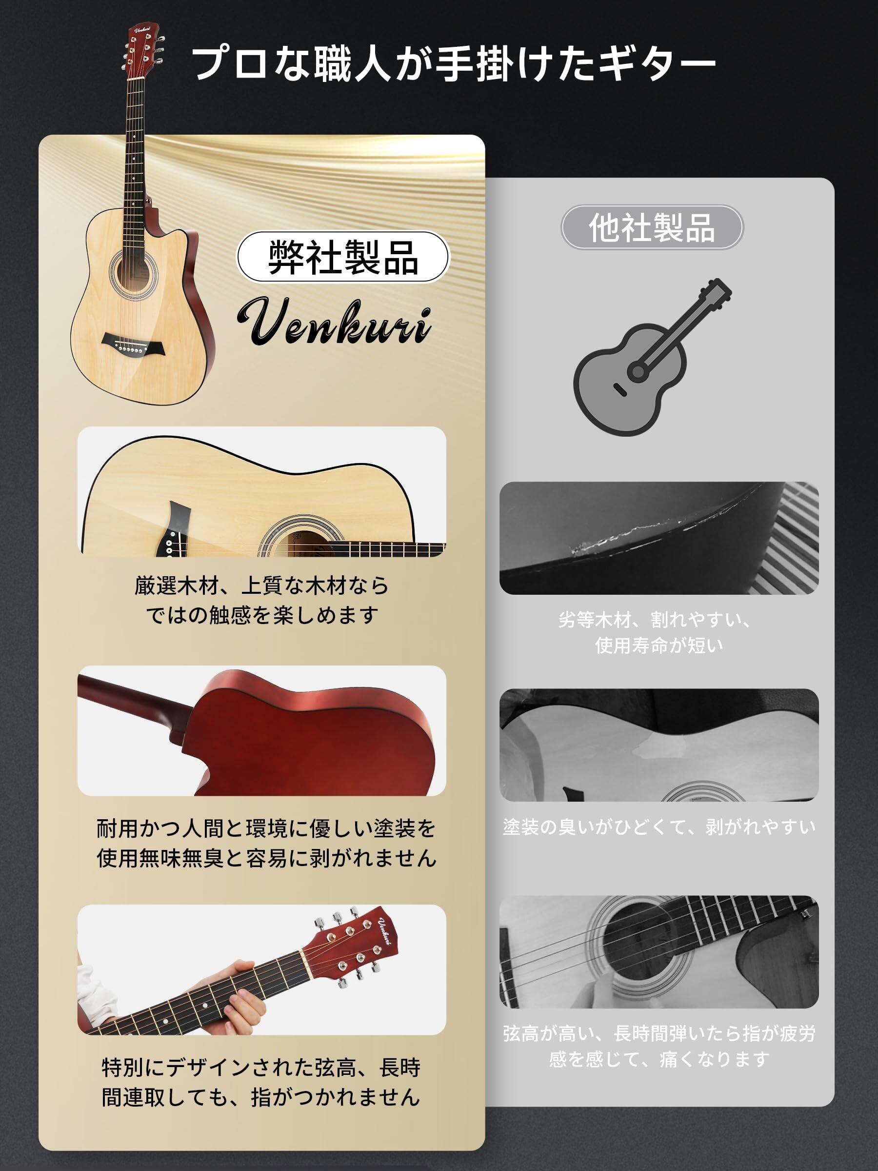 「専門な職人が手掛けた精緻な仕上がり」安定したブレイシング、標準的な樽型、精緻な仕上げ、ヘッドの初心者向け調整を備え、指板と弦の高さ差も特別にデザインされています。軽い押しで美しい音色を演奏でき、ギターの寸法は約96cm x 36.5cm x 8.5cmです。品質の木材を厳選し、湿気処理と真空乾燥を3年以上施しています。