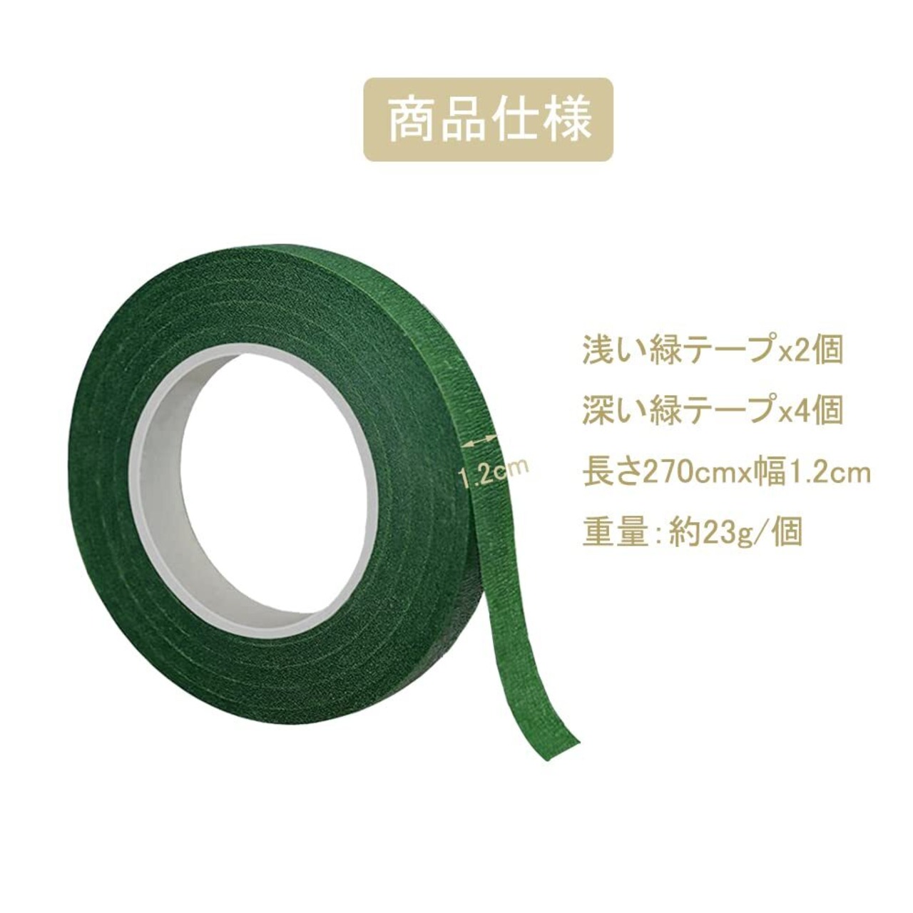【パッケージの内容】:浅い緑テープx2個、深い緑テープx4個、サイズ:長さ270cmx幅1.2cm、重量:約23g/個。