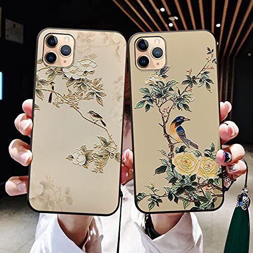 【柄】 背景はベージュ色です。木に鳥が止まった中国柄のスマホケースです。中国で鵲は吉祥のシンボルです。