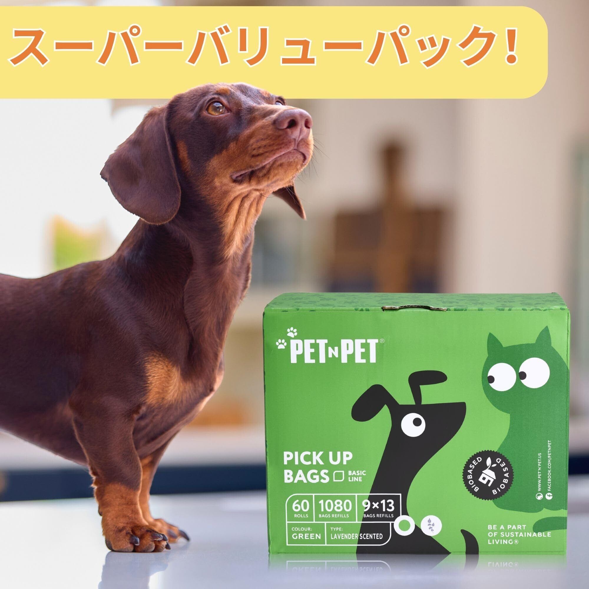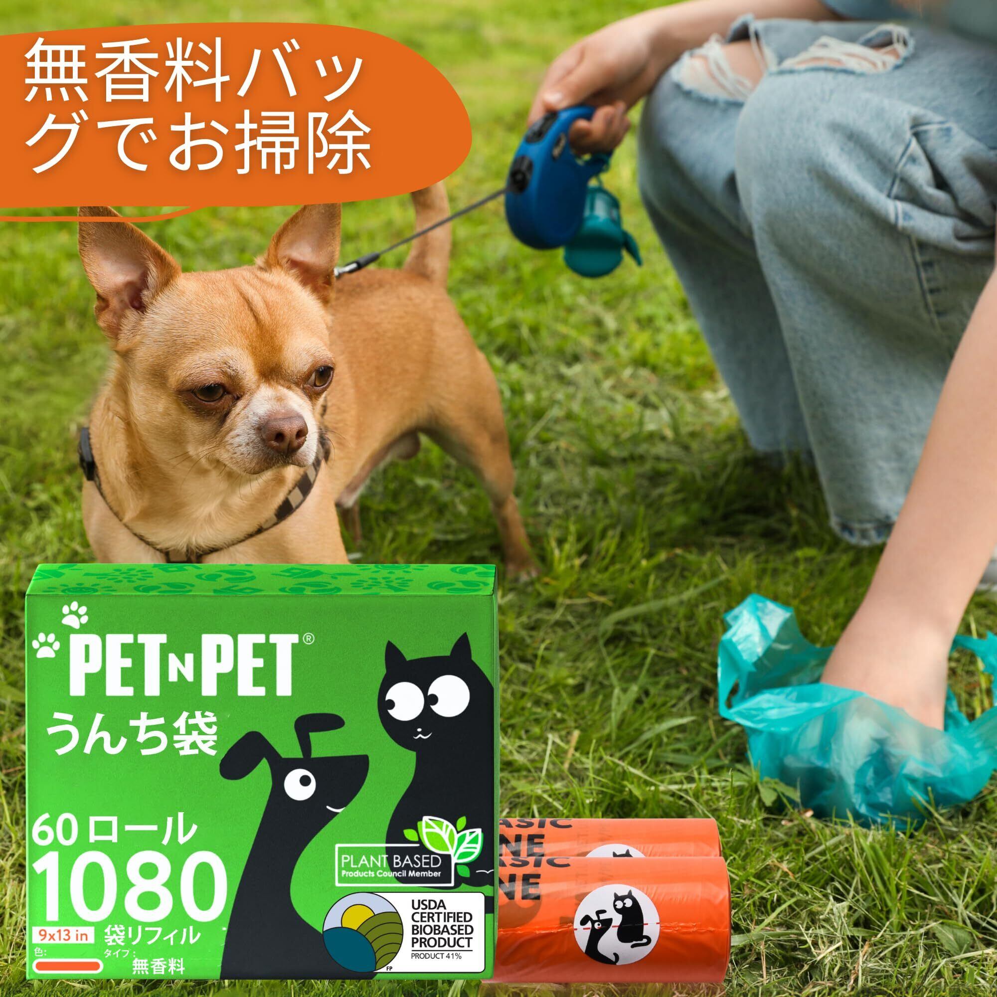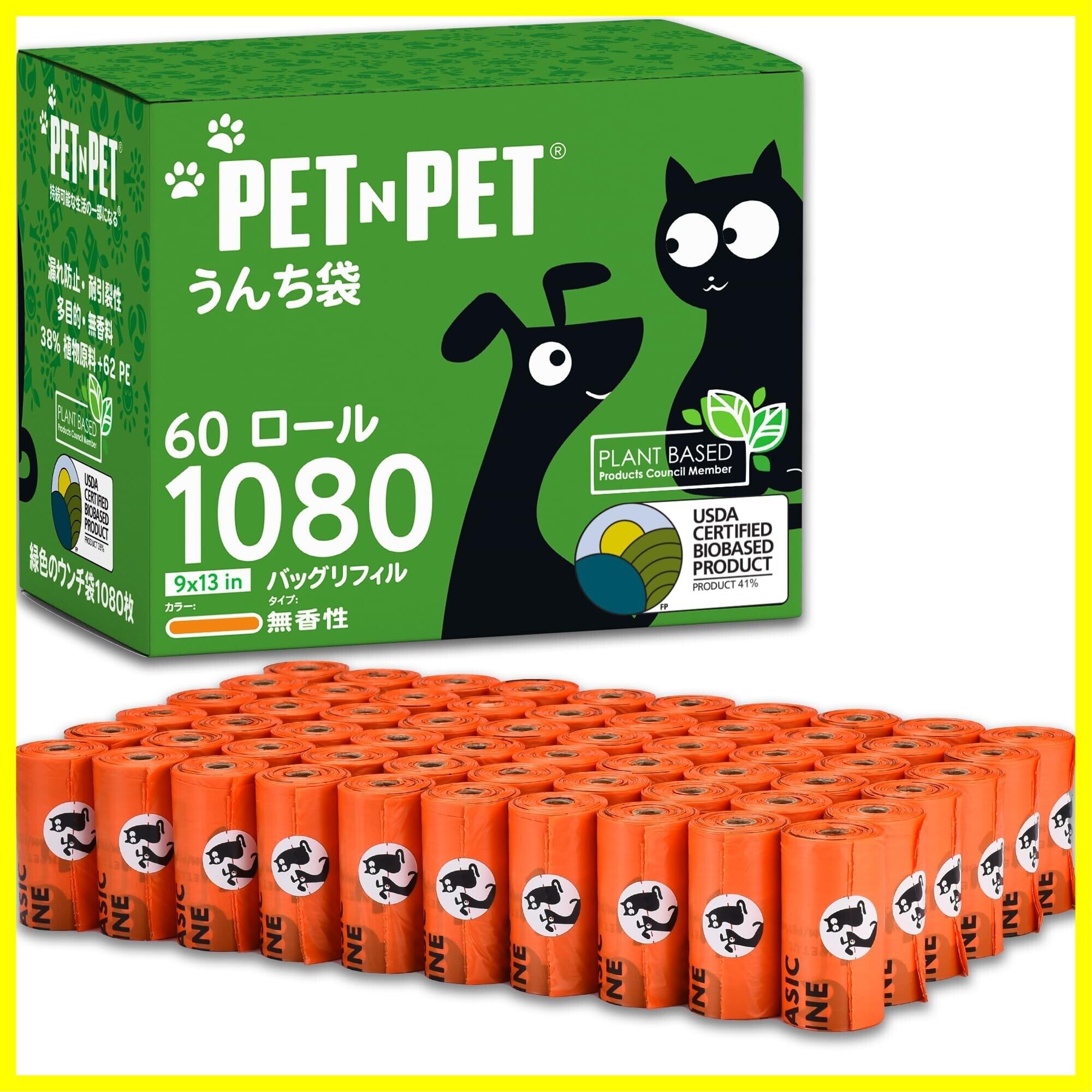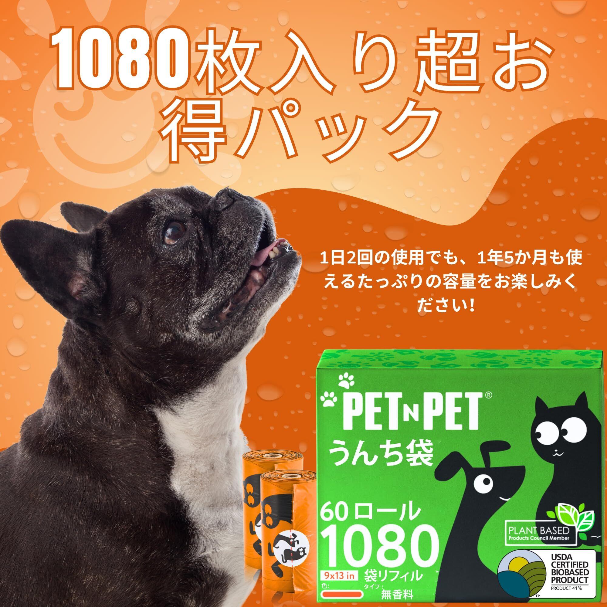 Pet N Pet うんち袋、エチケット袋、60ロール入り1080個、臭わない犬のうんち袋、犬の散歩用猫用トイレ袋、USDA認定 38% 植物由来 & 62% PE、漏れ防止で丈夫