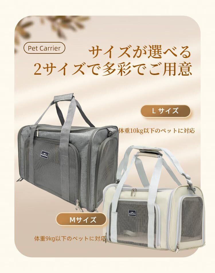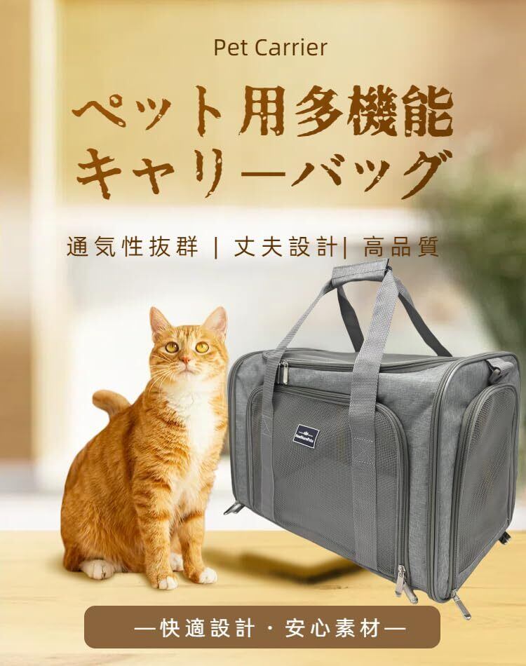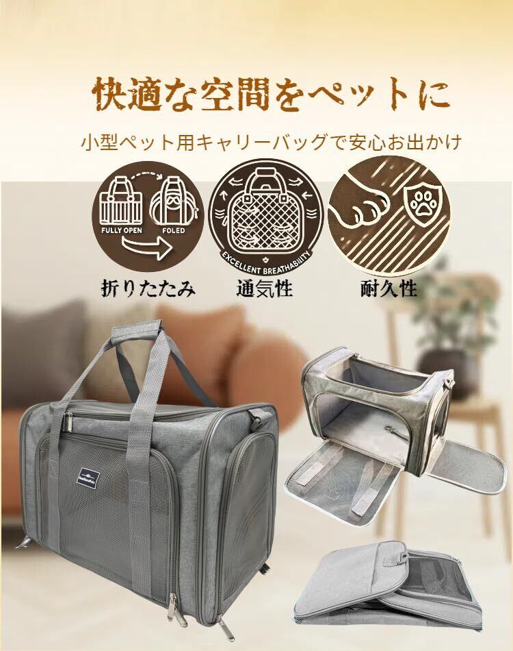 ペットキャリー 猫・小型犬用 4WAY 折りたたみ式 通気&軽量 洗える底マット付き 車載・旅行対応 Mサイズ 耐荷重7kg グレー