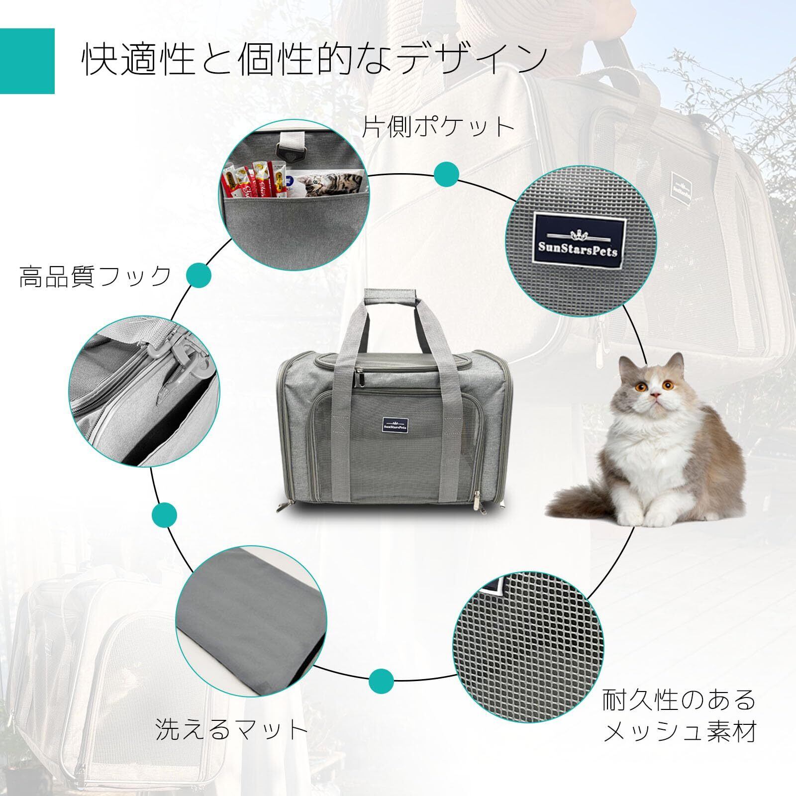 【4WAY持ち運び対応&収納ポケット付き】 手提げ・肩掛け・車載・スーツケース固定の4WAY設計で、シーンに応じて使い分け可能。背面にはキャリーバッグのハンドルに通せるスリーブ付きで、空港や電車移動にも便利です。片側には小物ポケットもあり、おやつ・おもちゃ・チュールなどを入れるのにも便利。どこへでも一緒に連れて行ける、多機能キャリーバッグです