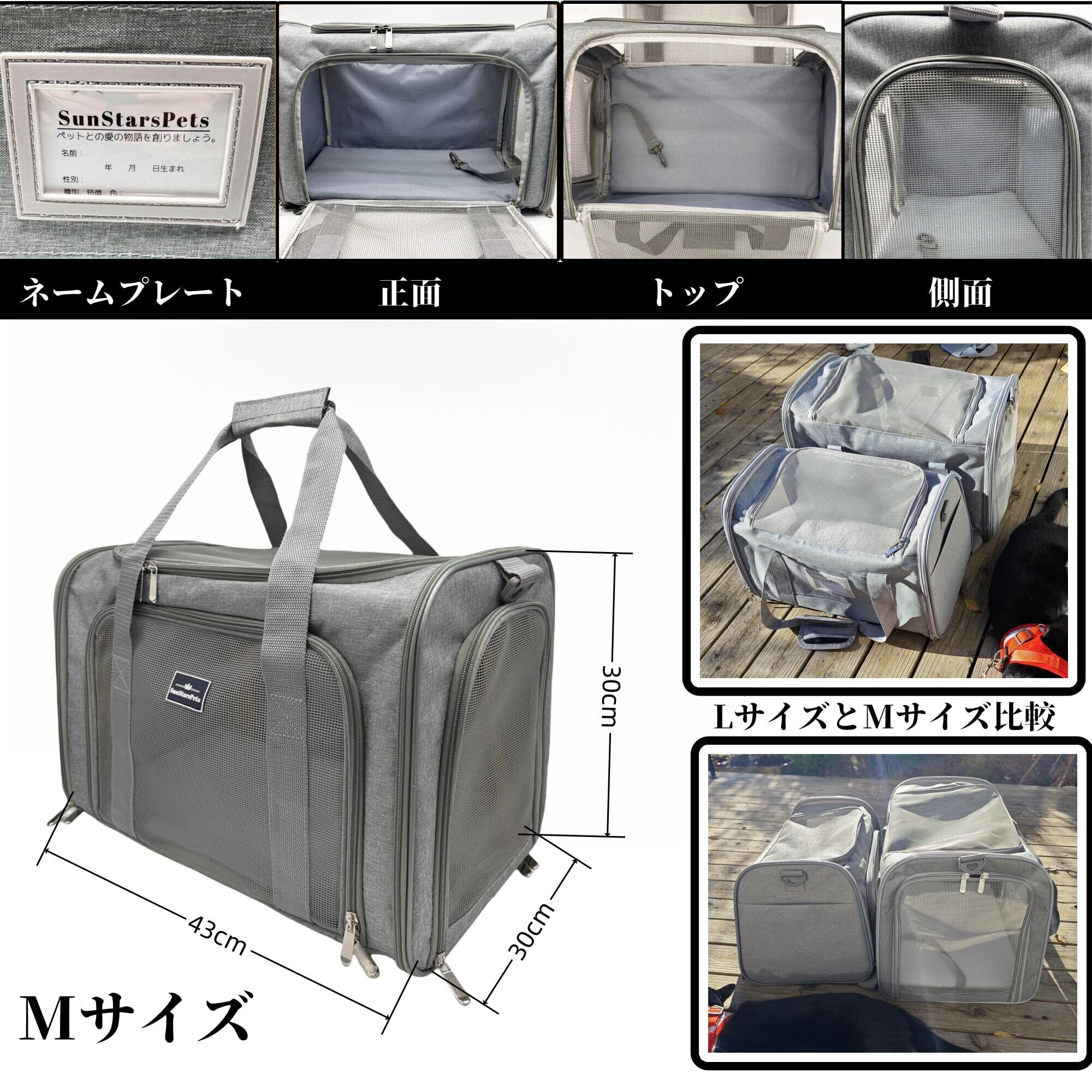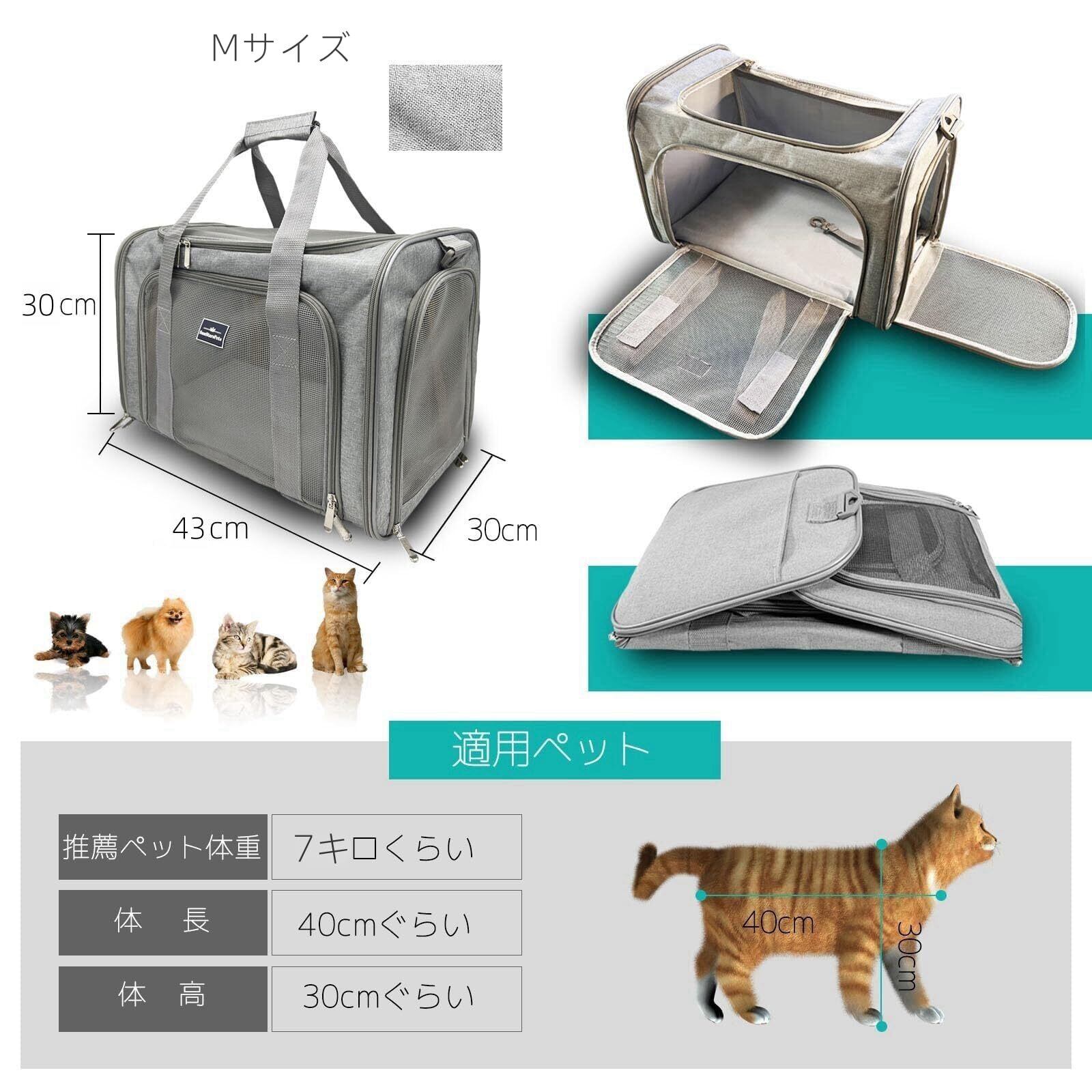 【商品仕様&適用サイズ】 展開サイズは長さ43×幅30×高さ30cm、本体重量は約1180g。7kg以下の小型ペット(猫・小型犬・うさぎ等)に最適です。付属品にはショルダーベルト、飛び出し防止リード、取り外せる中敷きマットが含まれています。車での通院や旅行、ドライブなど、様々な外出シーンで安心してお使いいただけます
