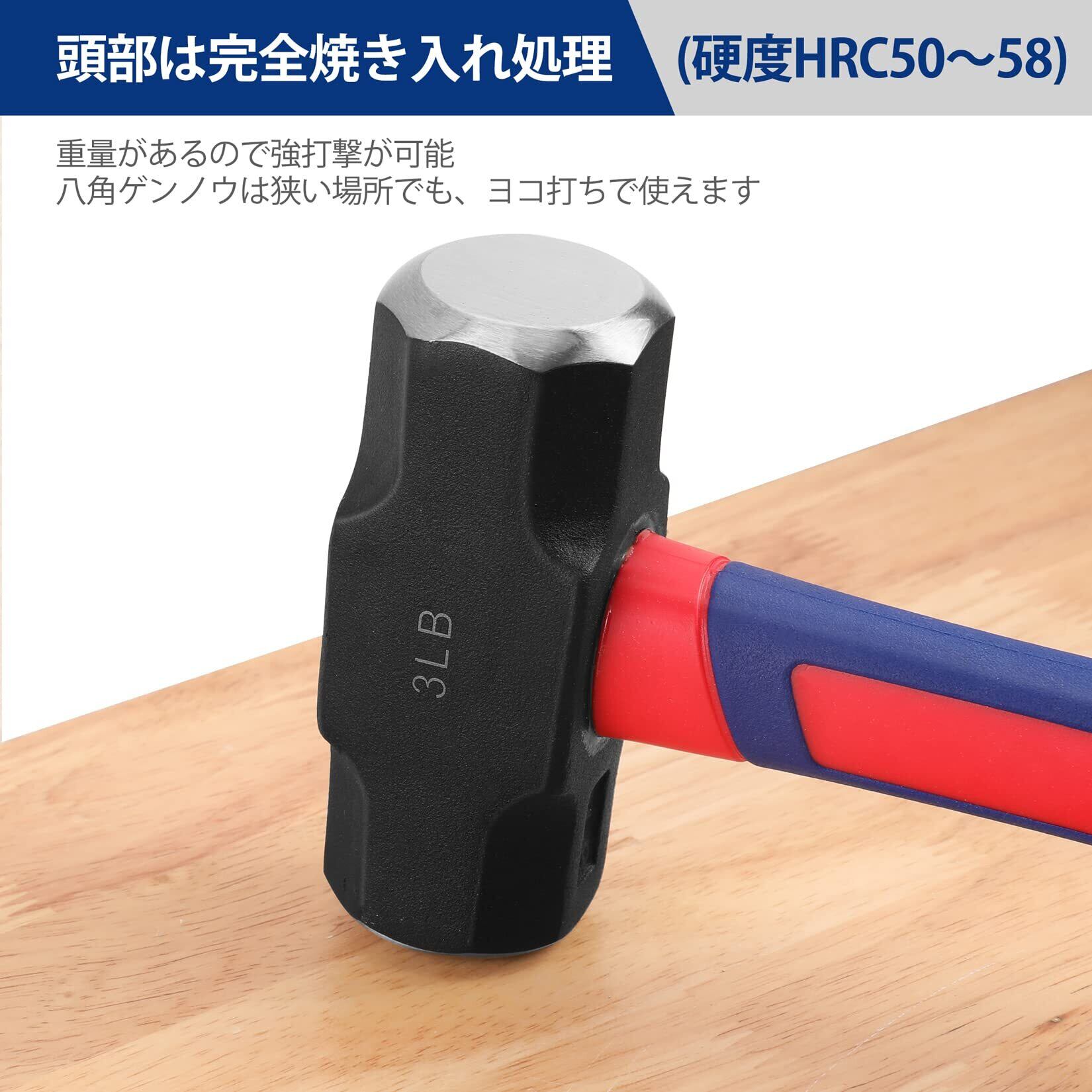 【八角ヘッド】頭部は完全焼き入れ処理され、重量があるので強打撃が可能です。八角ヘッドは狭い場所でも、ヨコ打ちで使えます。