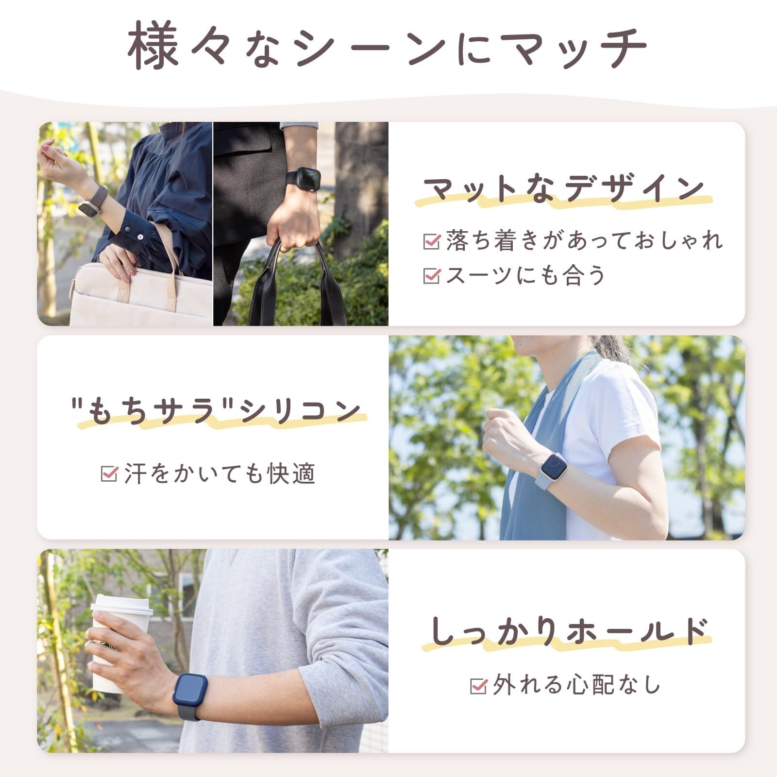 ▶▶▶【バンドサイズ】:S/Mサイズ 。純正のS/Mサイズ(短い方)と同等のサイズです。▶▶▶【手首周り】:約13~17cmまで対応 ▶▶▶【サイズ詳細】:ページ下部に掲載しております。購入前にご確認ください。▶▶▶【商品内容】:シリコンバンド×1本▶▶▶【厳選された「9色」】:「mochitto -もちっと- シリコンバンド」は、"くすみカラー"を中心に、カジュアルでもビジネスでも活用しやすい、上品な9色のカラーバリエーションをご用意しました。▶▶▶【"もちサラ"触感】:軽量でサラサラ触感の上質シリコンを採用することにより抜群の着け心地になりました。